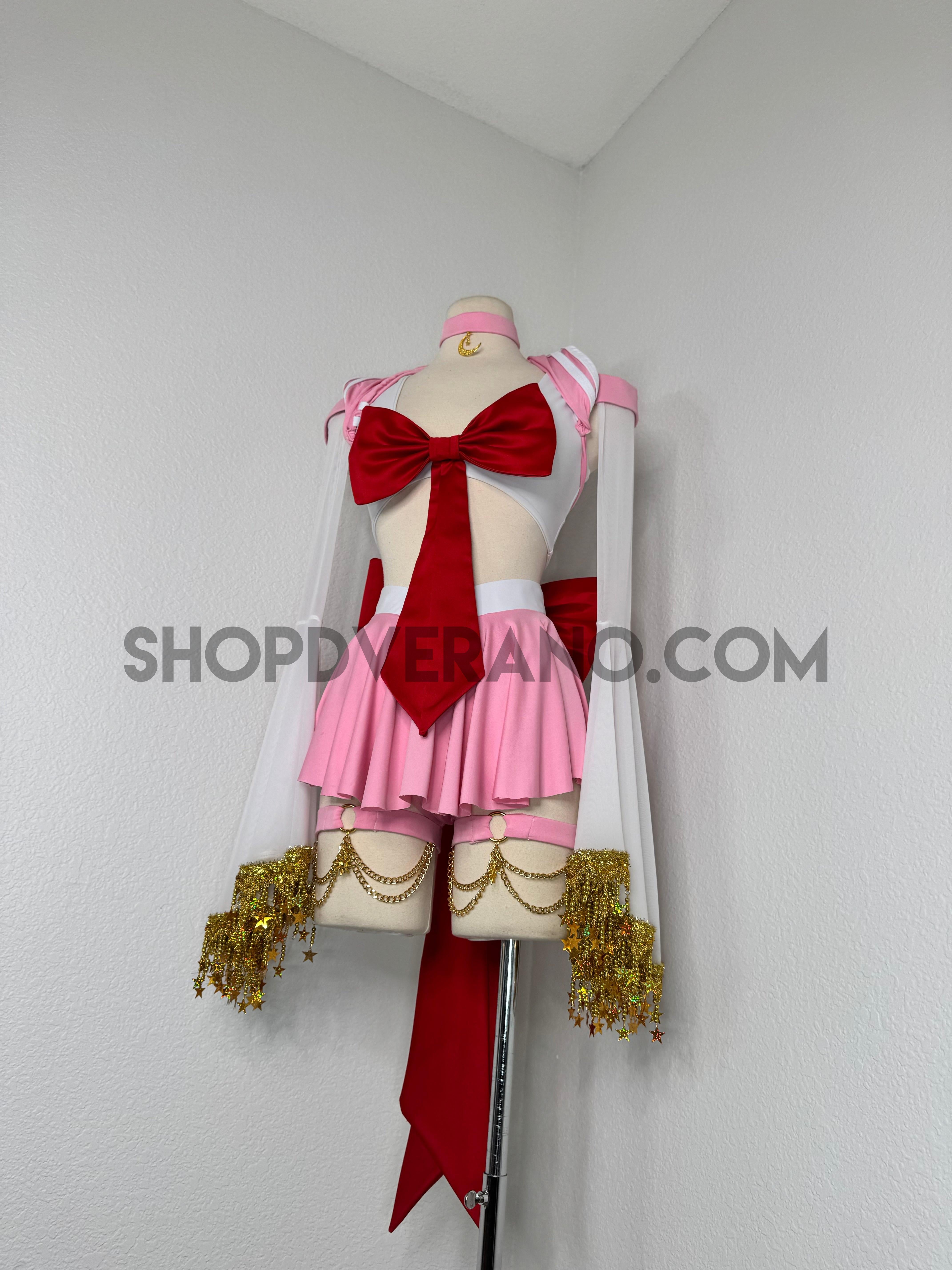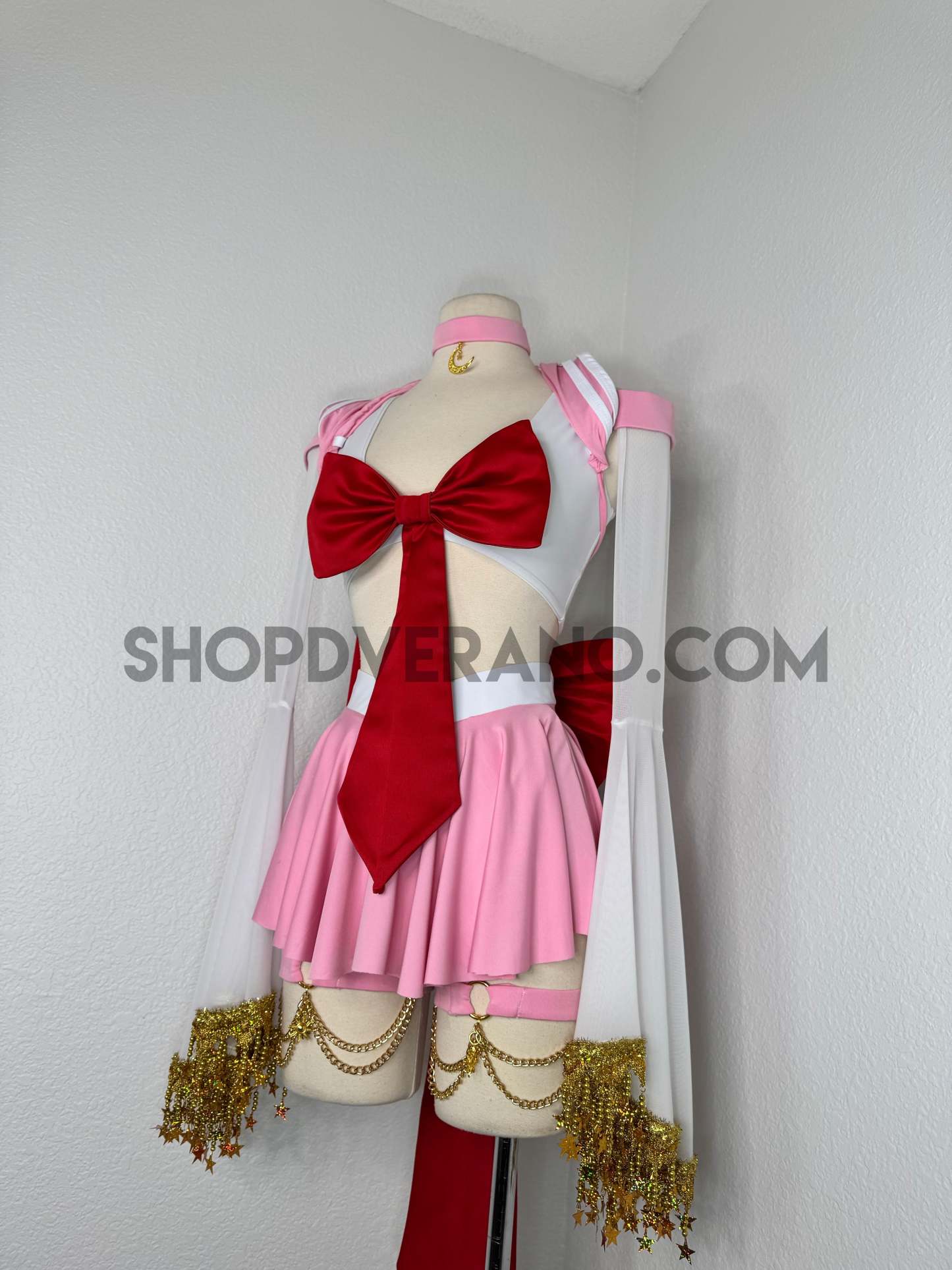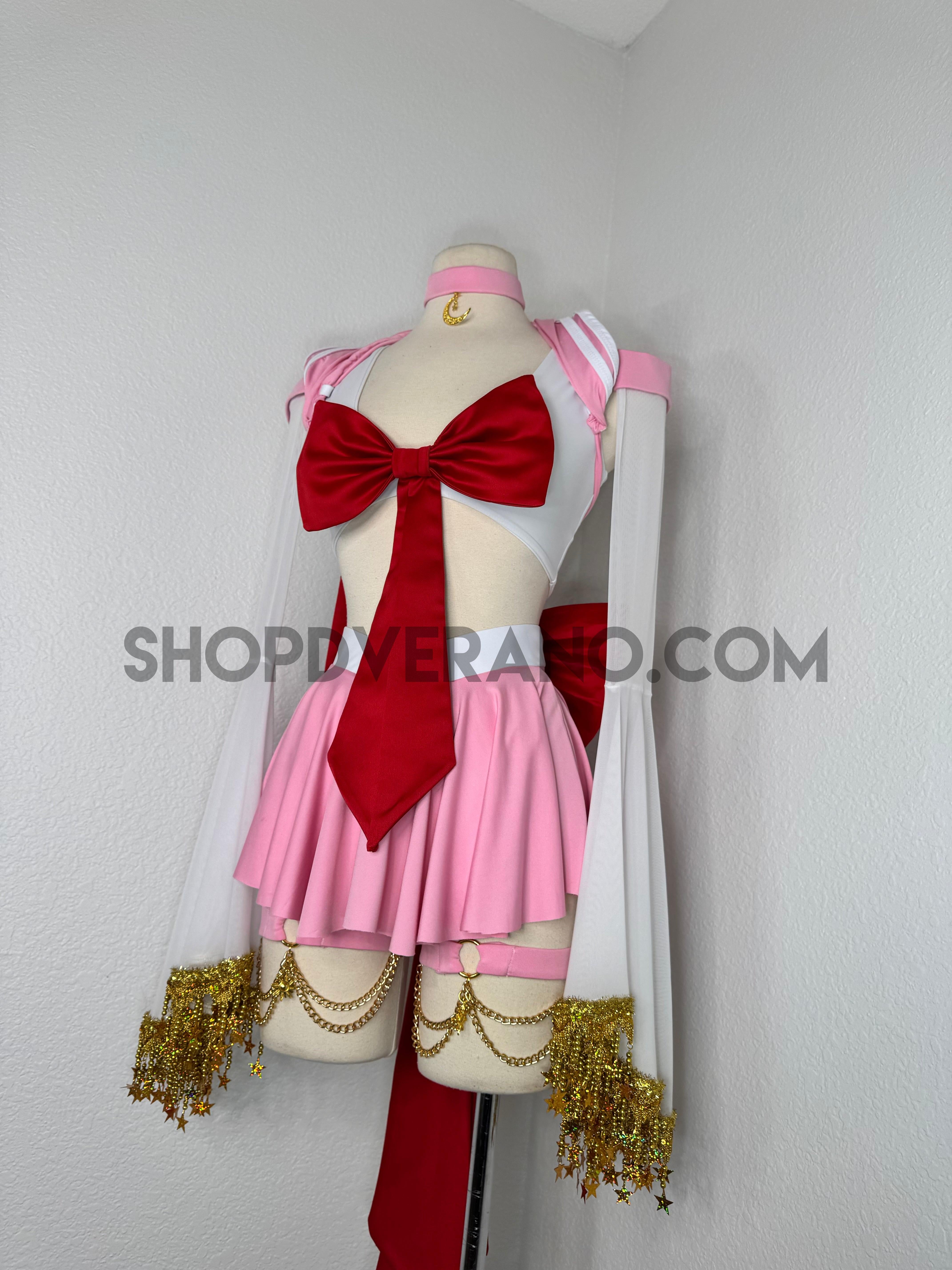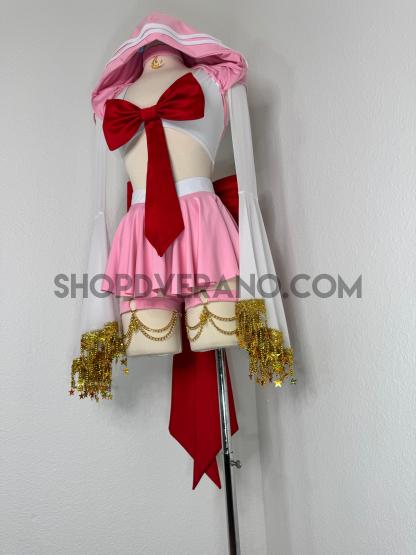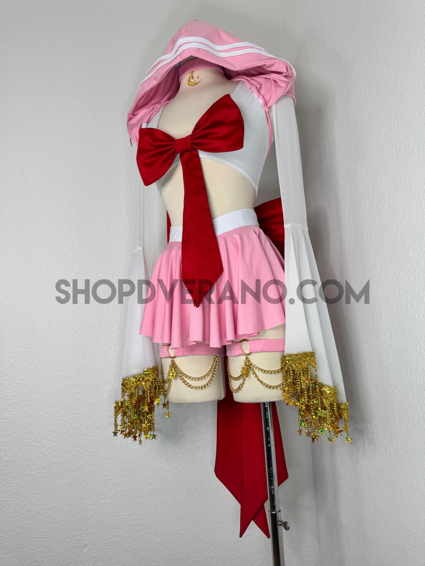 This unique ensemble features a mini skirt paired with a white crop top adorned with a removable bow. The set includes dramatic detachable sleeves in coordinating colors, finished with golden star fringe around the bell cuffs for an elegant, flowing silhouette and a distinctive celestial touch. The set also includes matching leg straps embellished with delicate gold chains and sun charms for the perfect finishing accent.