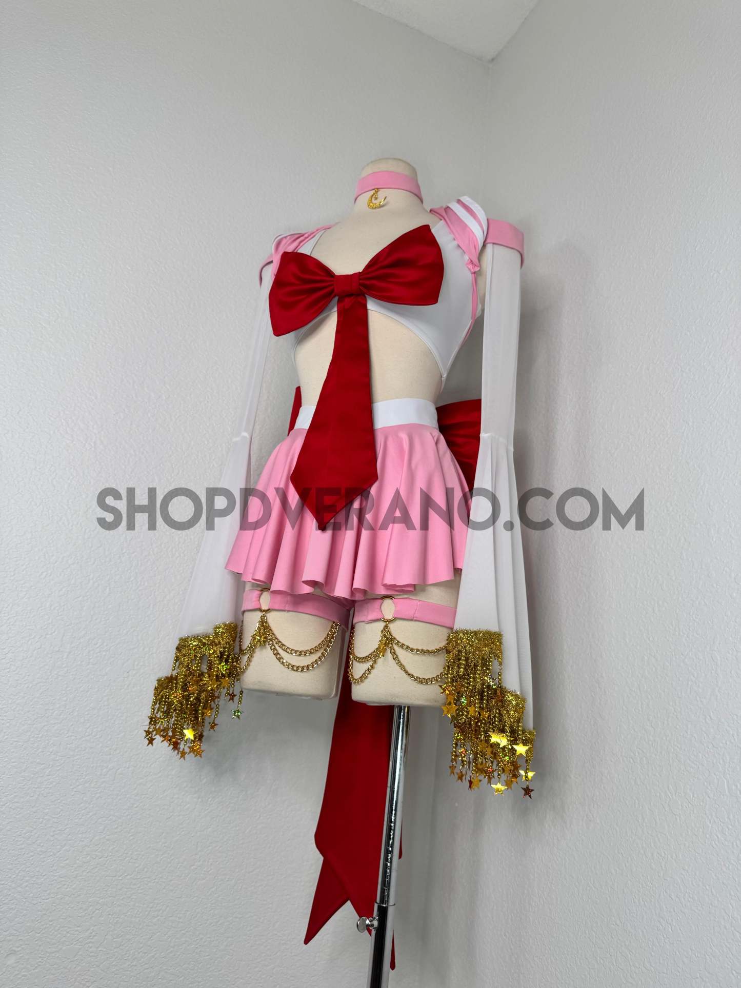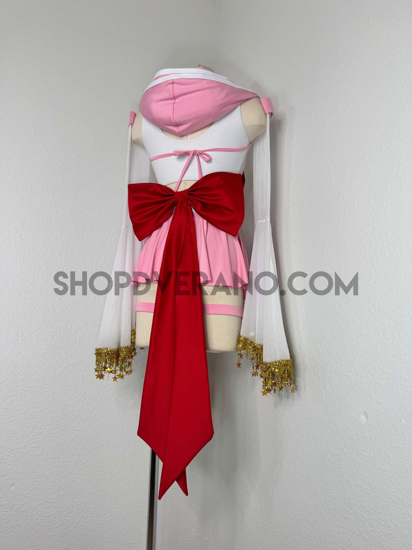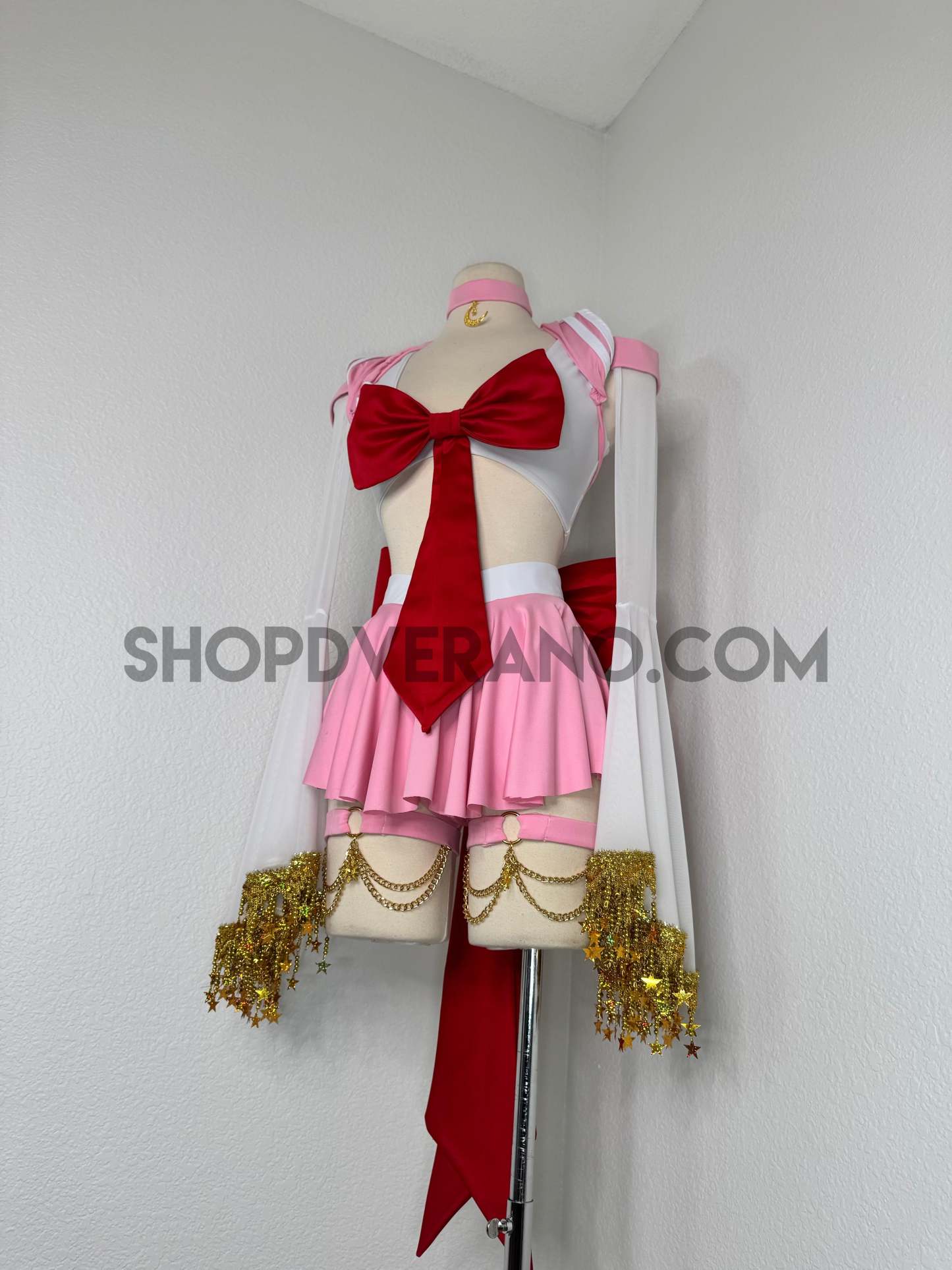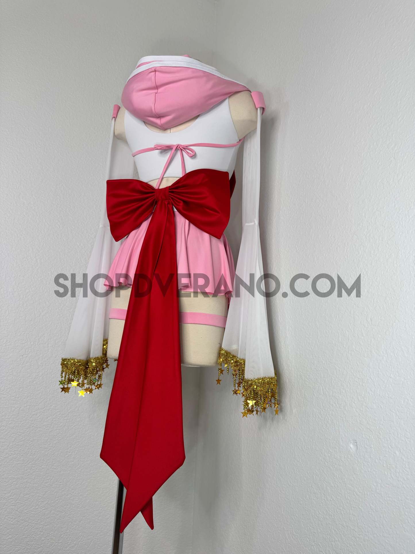 This unique ensemble features a mini skirt paired with a white crop top adorned with a removable bow. The set includes dramatic detachable sleeves in coordinating colors, finished with golden star fringe around the bell cuffs for an elegant, flowing silhouette and a distinctive celestial touch. The set also includes matching leg straps embellished with delicate gold chains and sun charms for the perfect finishing accent.