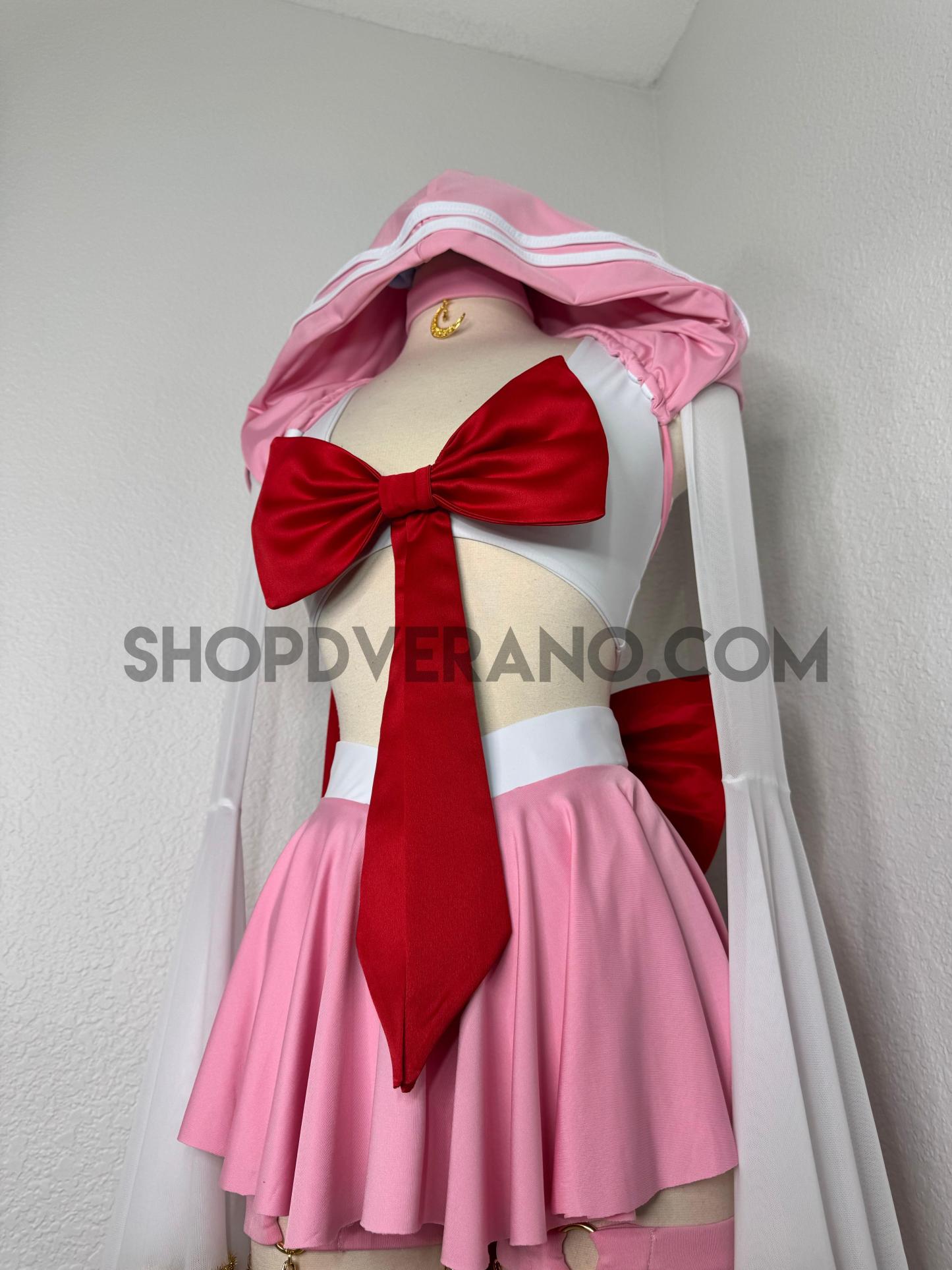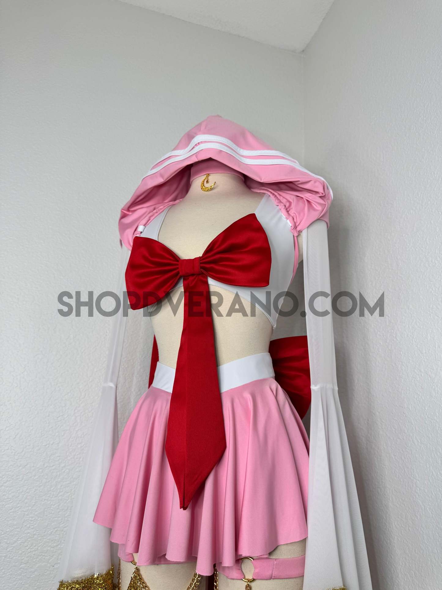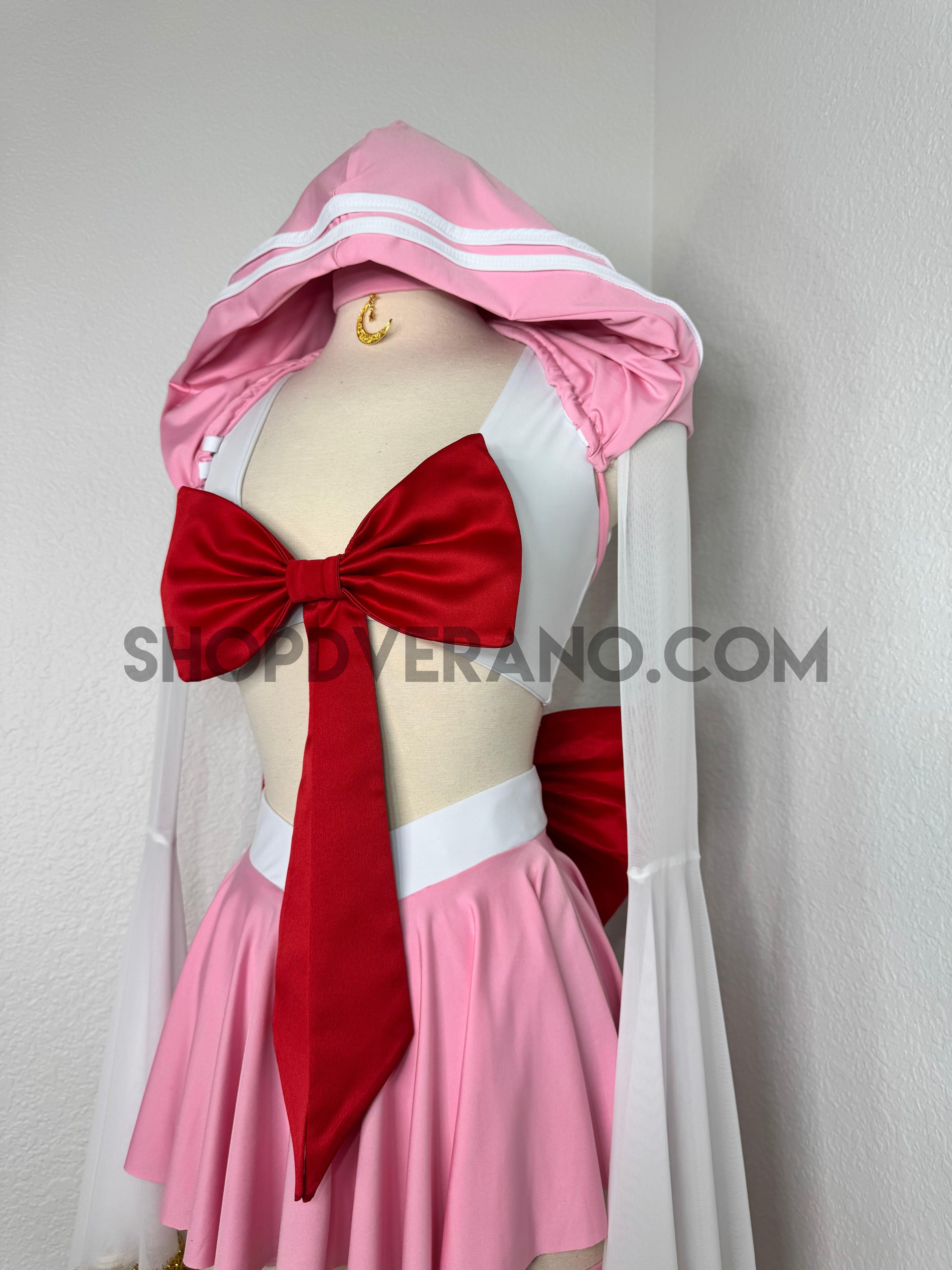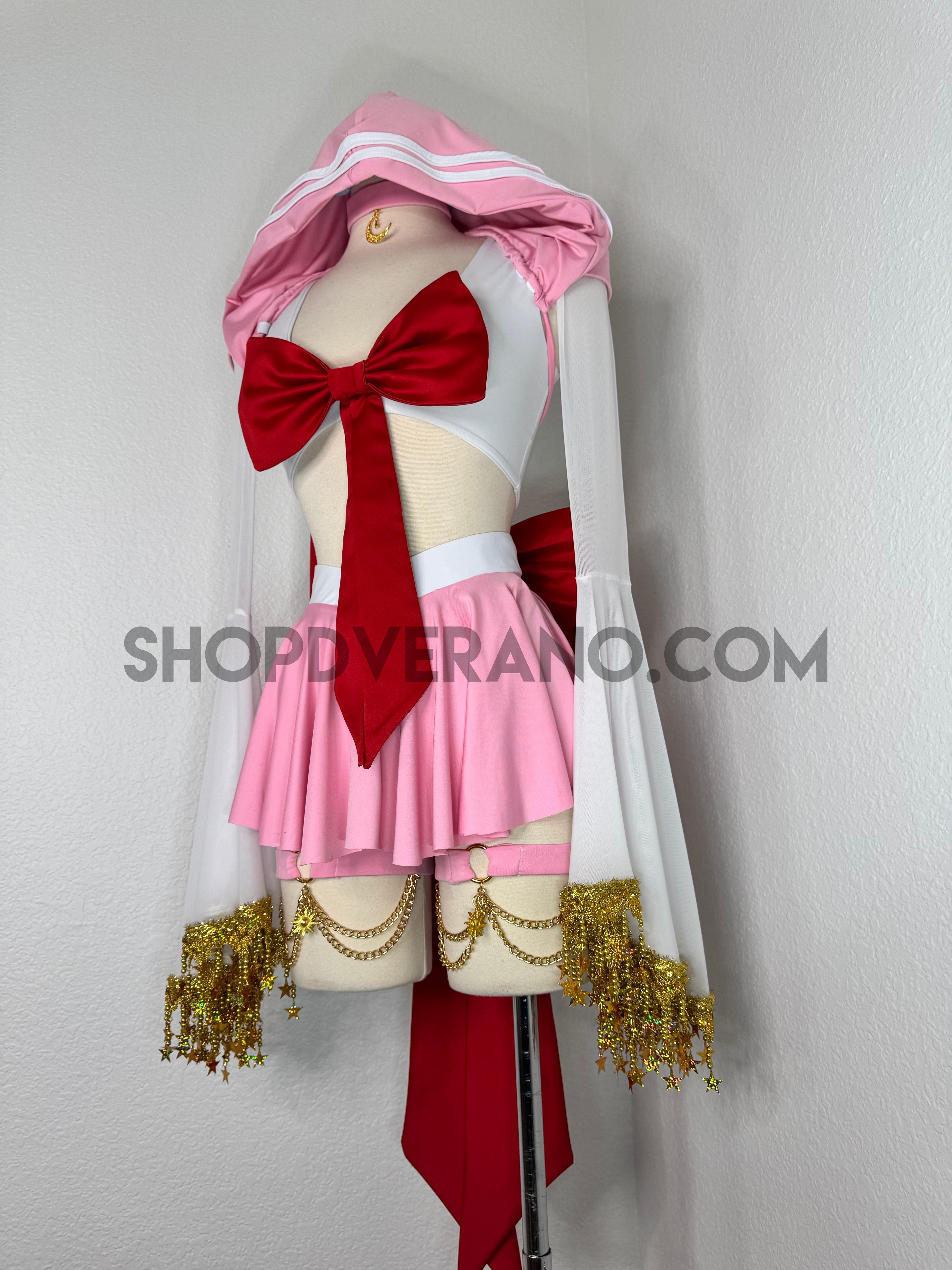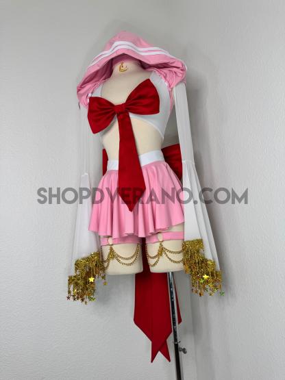 The look is completed with unique hoodie with white stripe detailing, an oversized back bow with a cascading touch, and a matching crescent moon choker—perfect for channeling your inner heroine, whether you’re dancing under festival lights or stepping into character at your next convention.