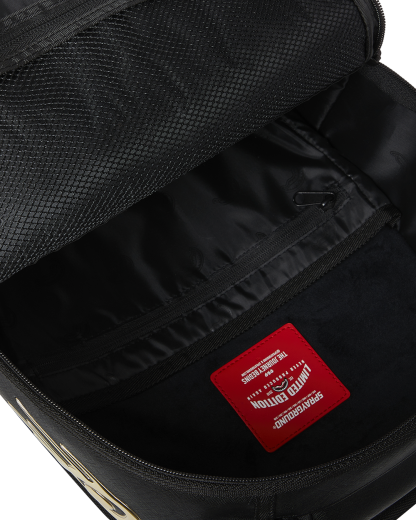 Dimensions: 18" x 6" x 11.5" • Front zipper pocket • Side pockets • Zippered Stash pocket • Separate velour sunglass compartment • Ergonomic mesh back padding • Adjustable Straps for custom sizing • Gold zippers with metal hardware • Metal "Sprayground Authentic" badge • Slide through back sleeve connects to carry-on luggage to free your hands