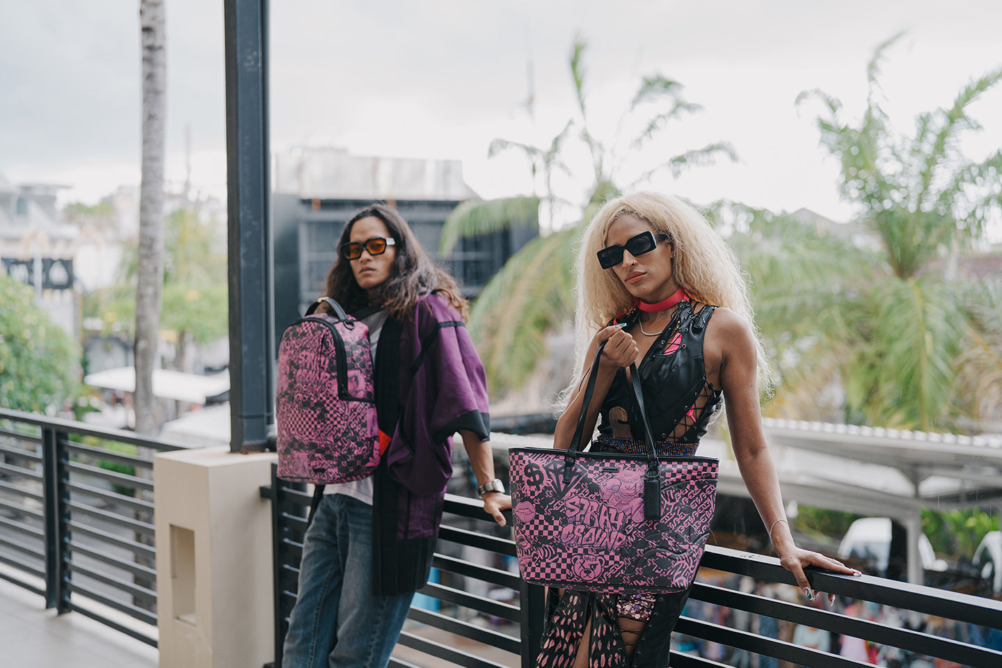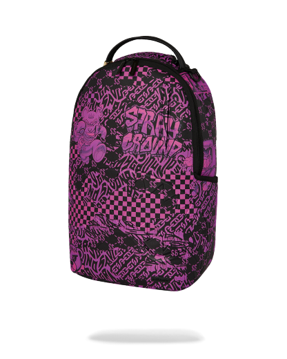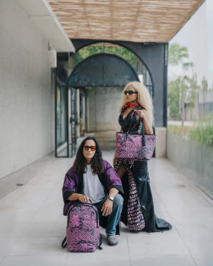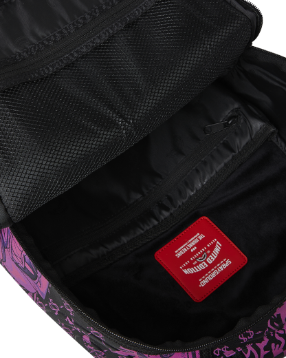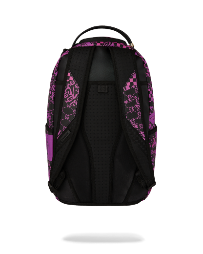 Dimensions: 18" x 6" x 11.5" • Front zipper pocket • Side pockets • Zippered Stash pocket • Separate velour sunglass compartment • Ergonomic mesh back padding • Adjustable Straps for custom sizing • Gold zippers with metal hardware • Metal "Sprayground Authentic" badge • Slide through back sleeve connects to carry-on luggage to free your hands