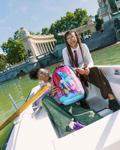 Dimensions: 18" x 6" x 11.5" • Front zipper pocket • Side pockets • Zippered Stash pocket • Separate velour sunglass compartment • Ergonomic mesh back padding • Adjustable Straps for custom sizing • Gold zippers with metal hardware • Metal "Sprayground Authentic" badge • Slide through back sleeve connects to carry-on luggage to free your hands