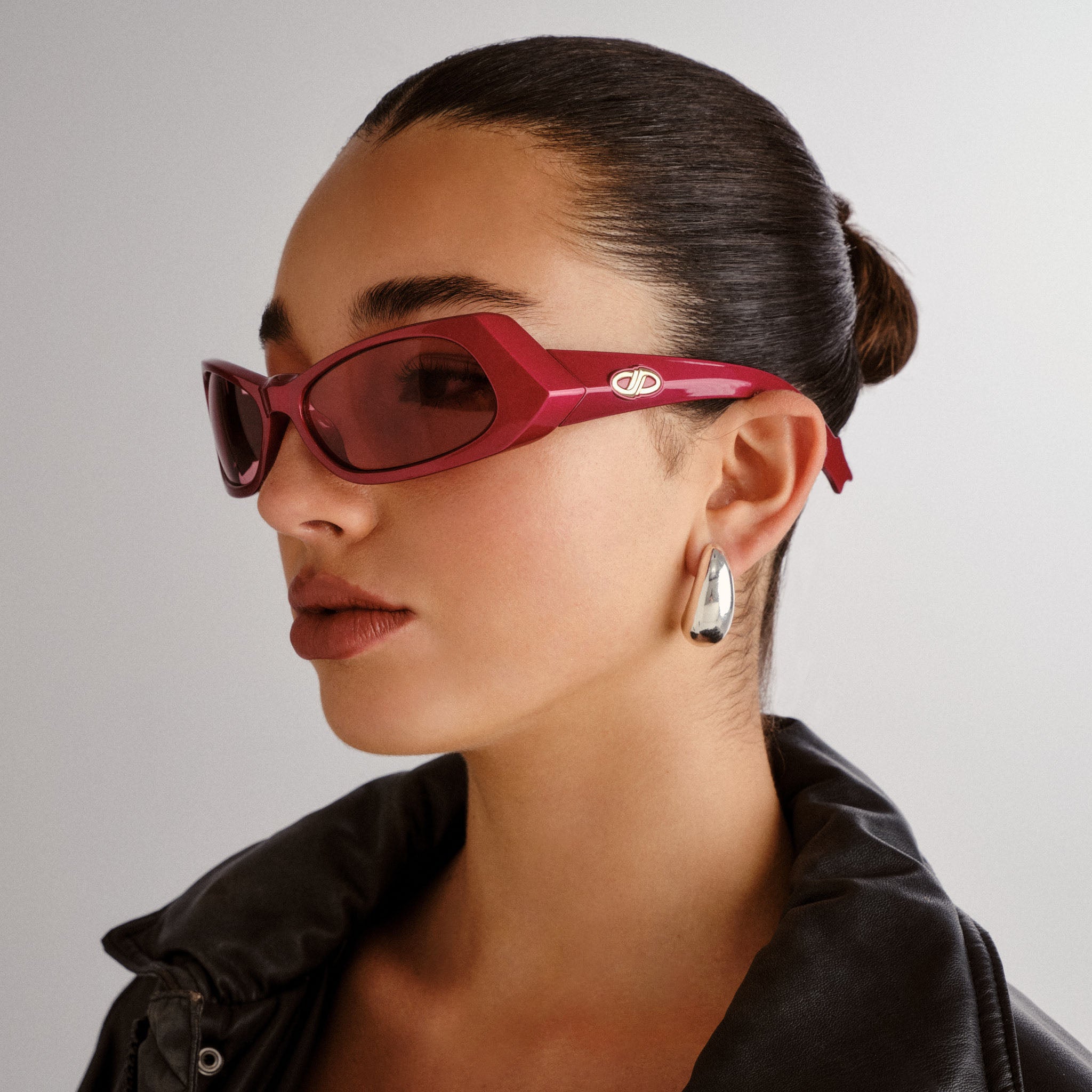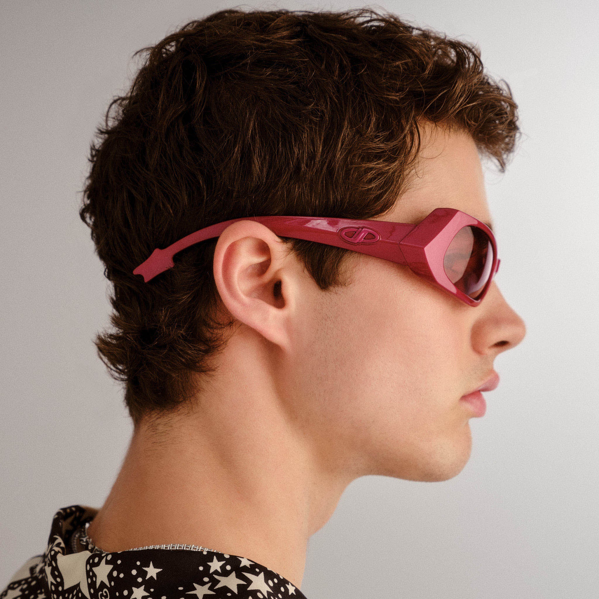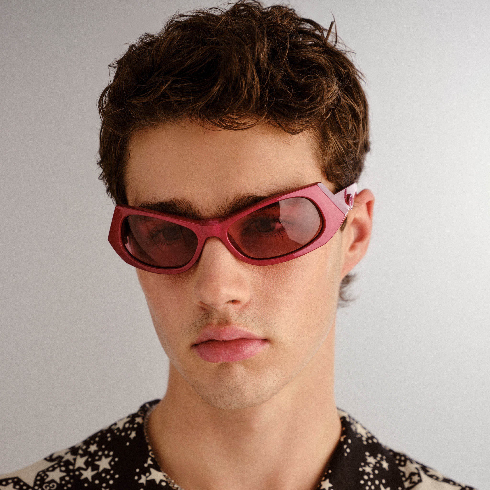• Finished in a galactic magenta frame with smokey pink mono lenses.