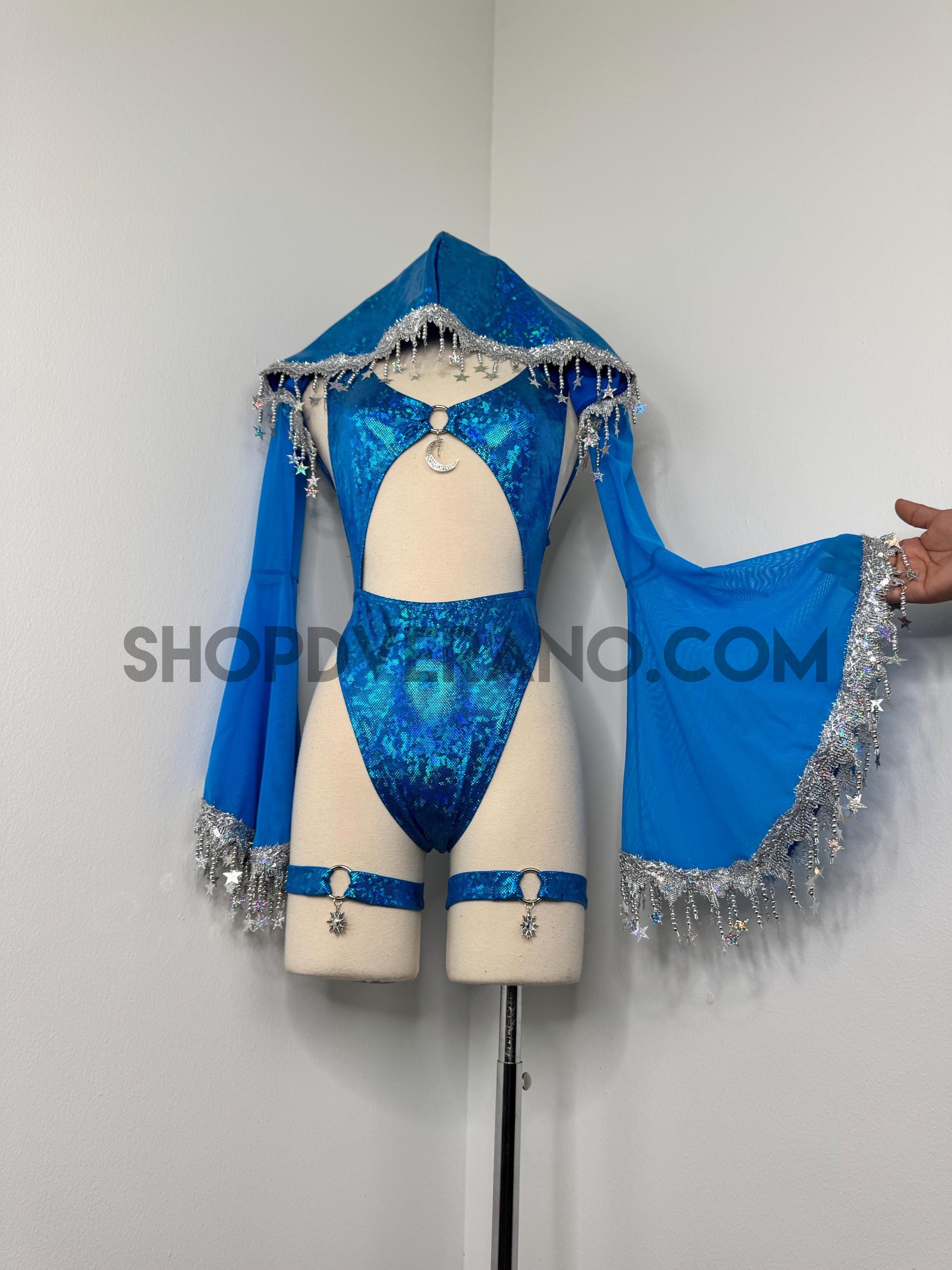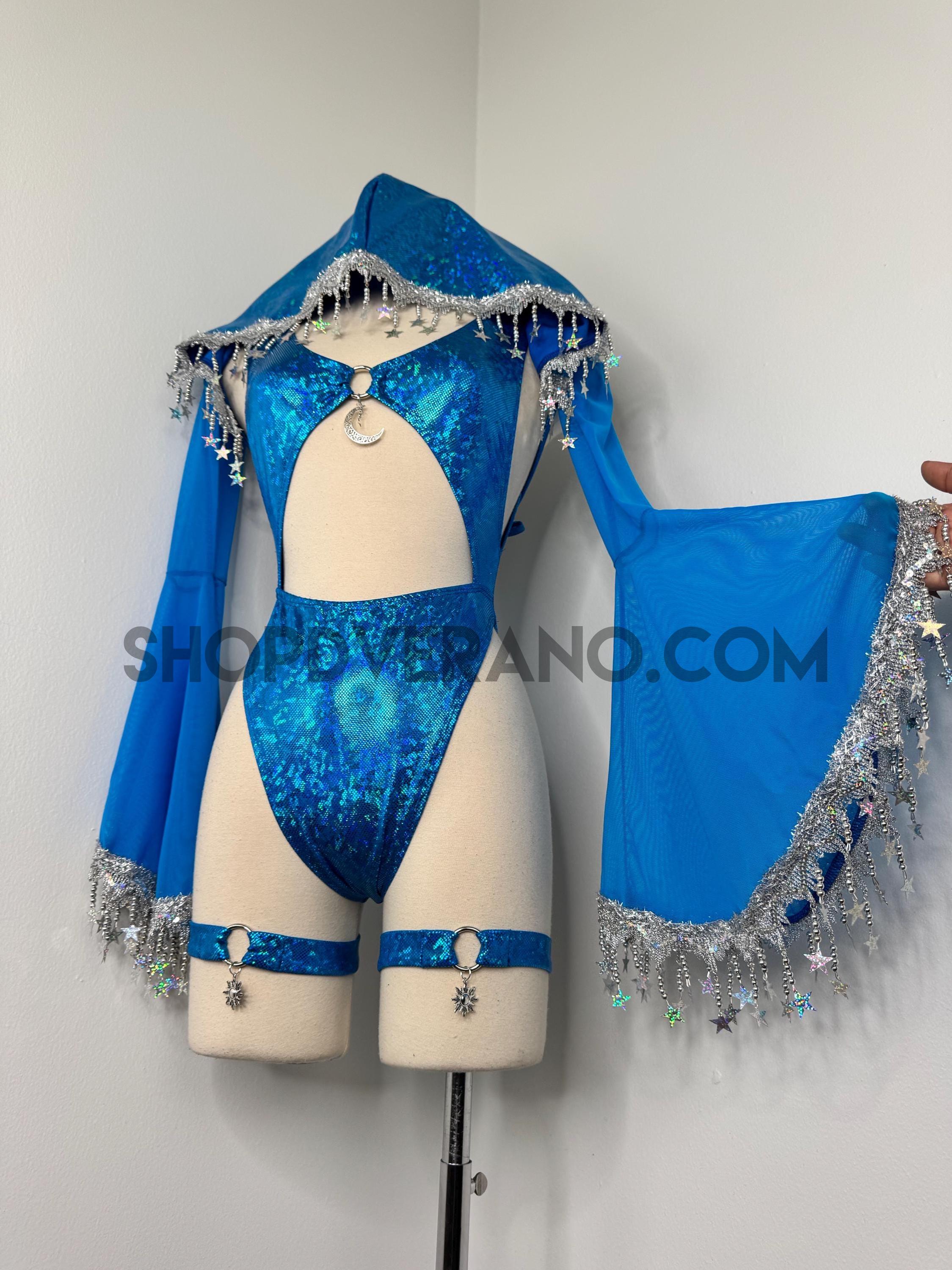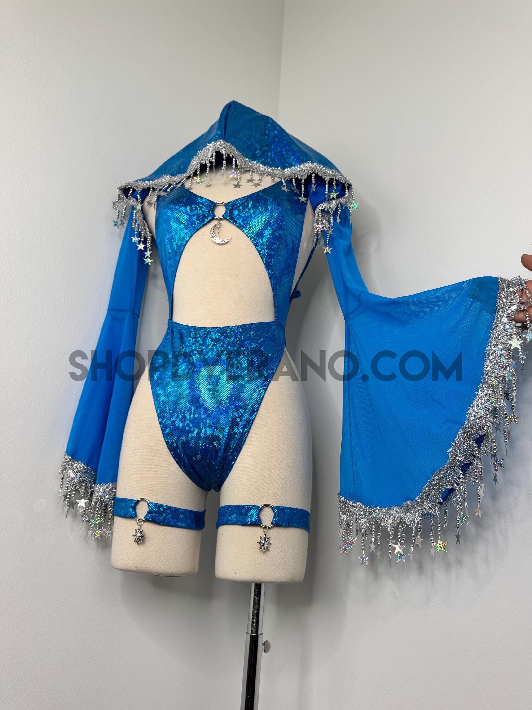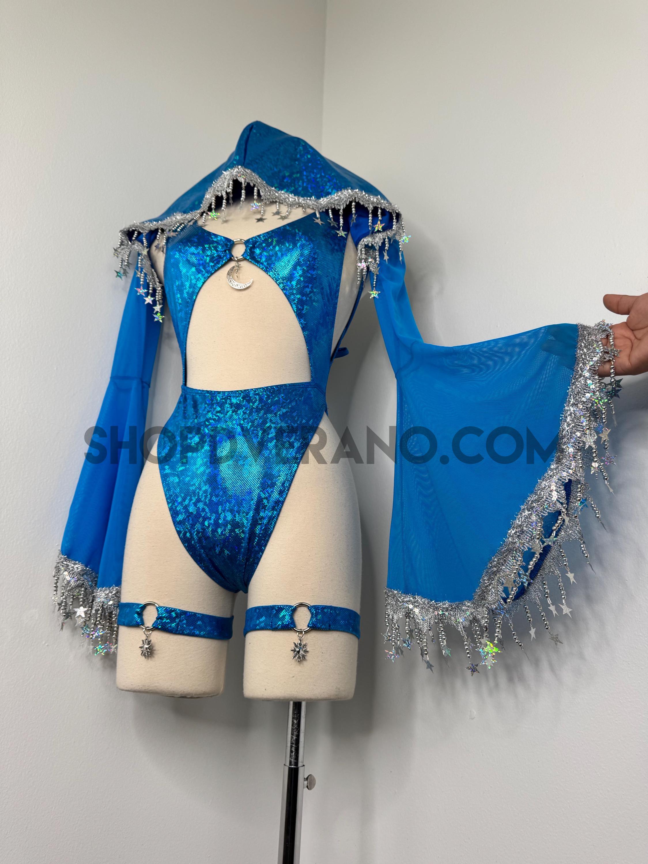 The look is elevated with a matching hooded bolero featuring star trim, adding celestial drama and movement, while flowing sleeves create an ethereal, siren-inspired silhouette. Elastic legs straps finish the look with a bold, statement touch that ties the entire set together.