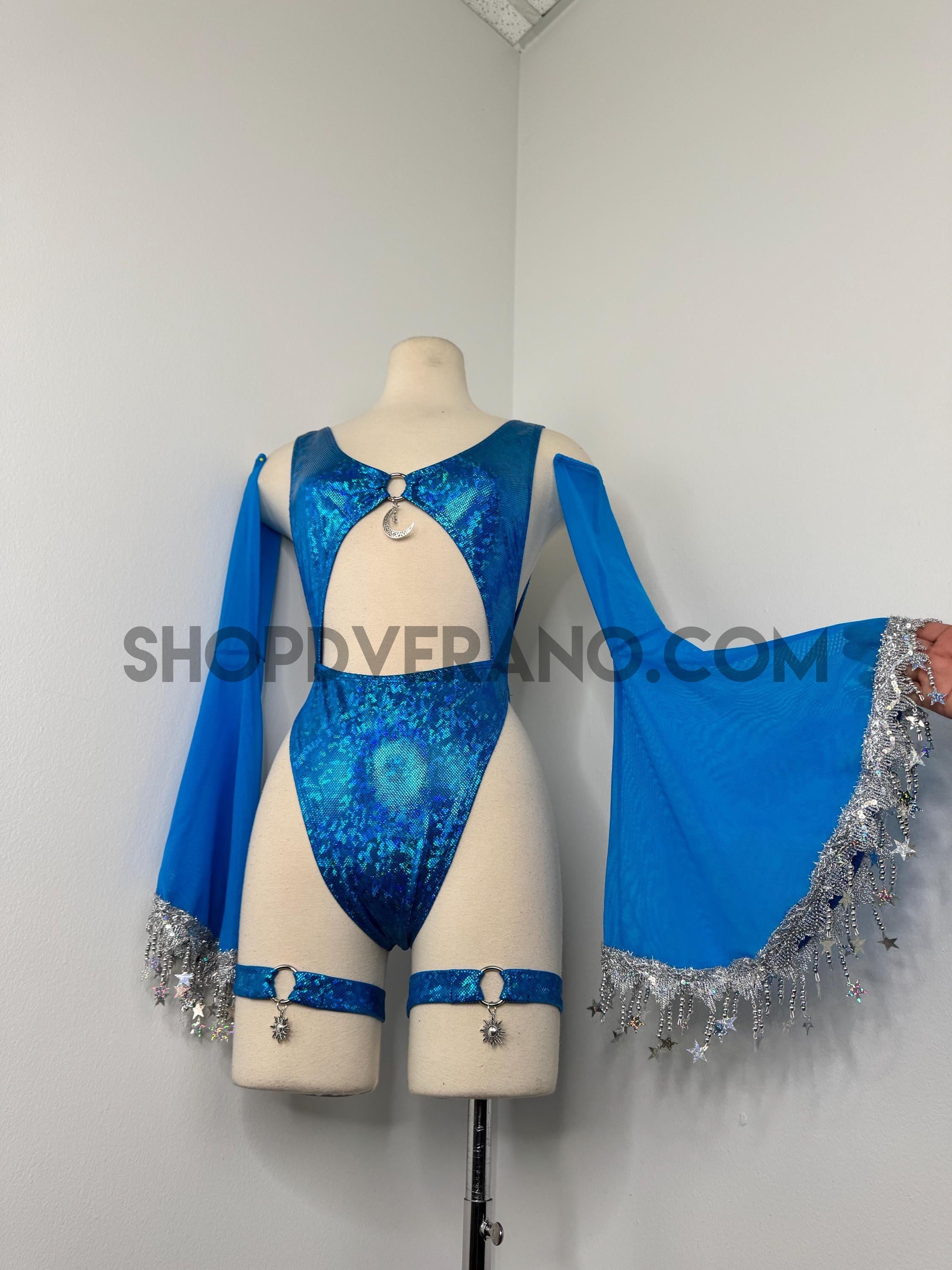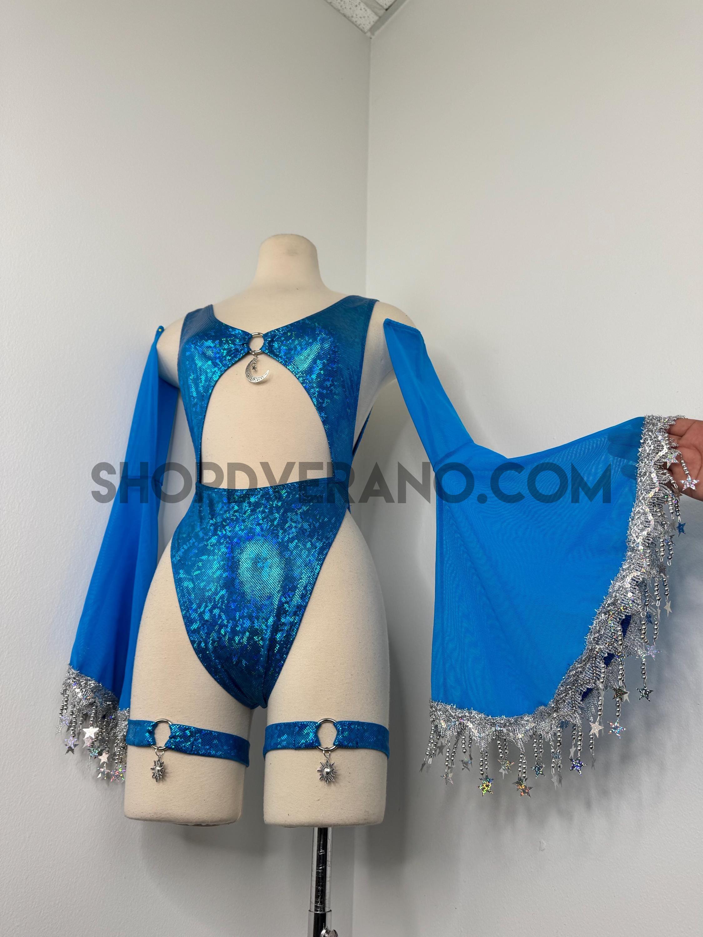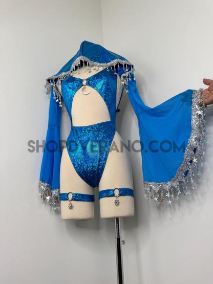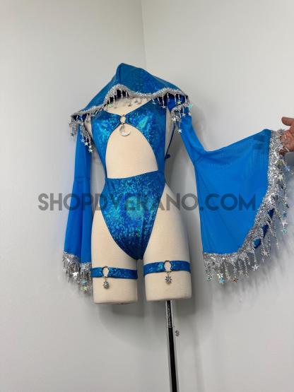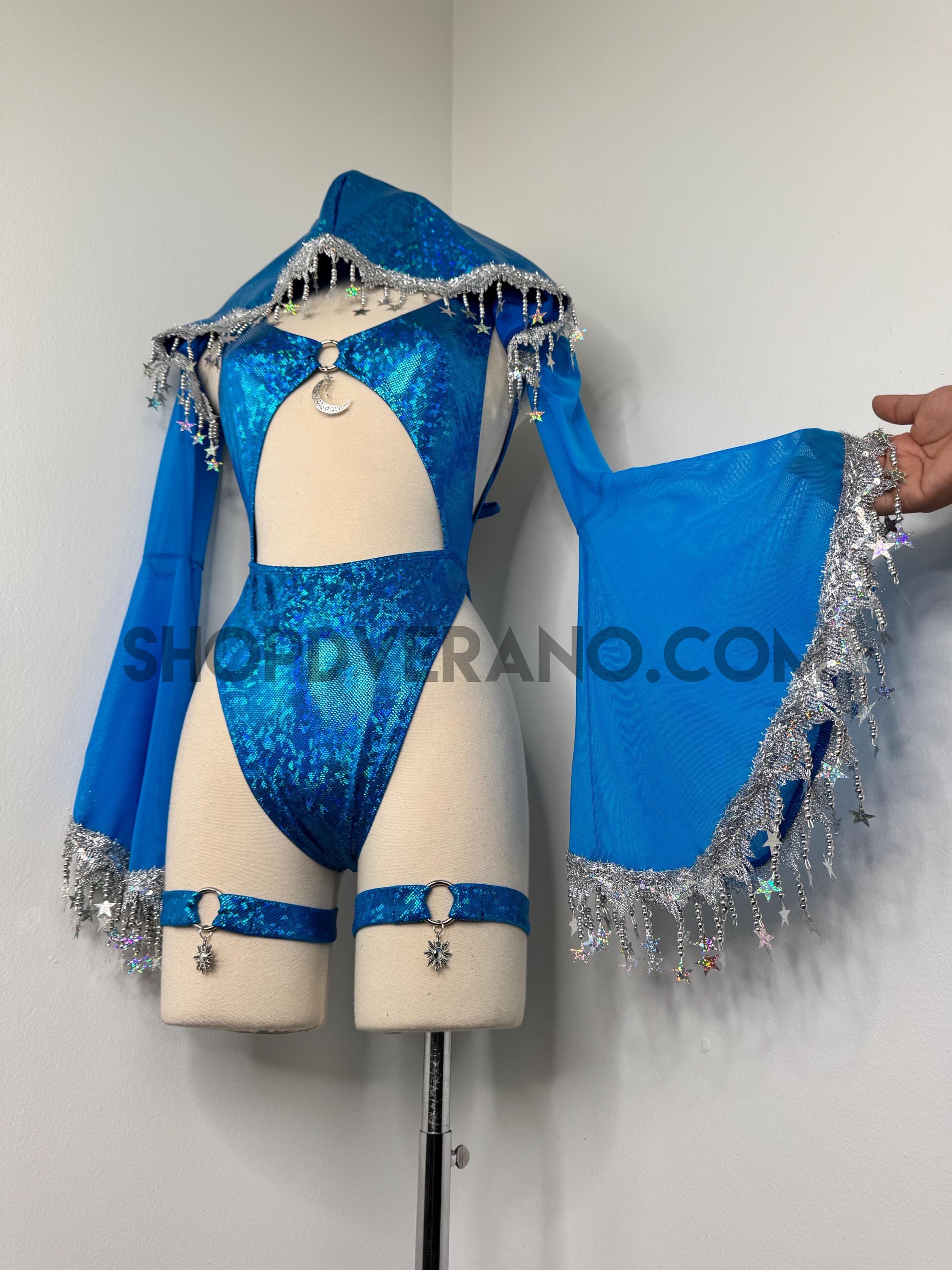 The look is elevated with a matching hooded bolero featuring star trim, adding celestial drama and movement, while flowing sleeves create an ethereal, siren-inspired silhouette. Elastic legs straps finish the look with a bold, statement touch that ties the entire set together.
