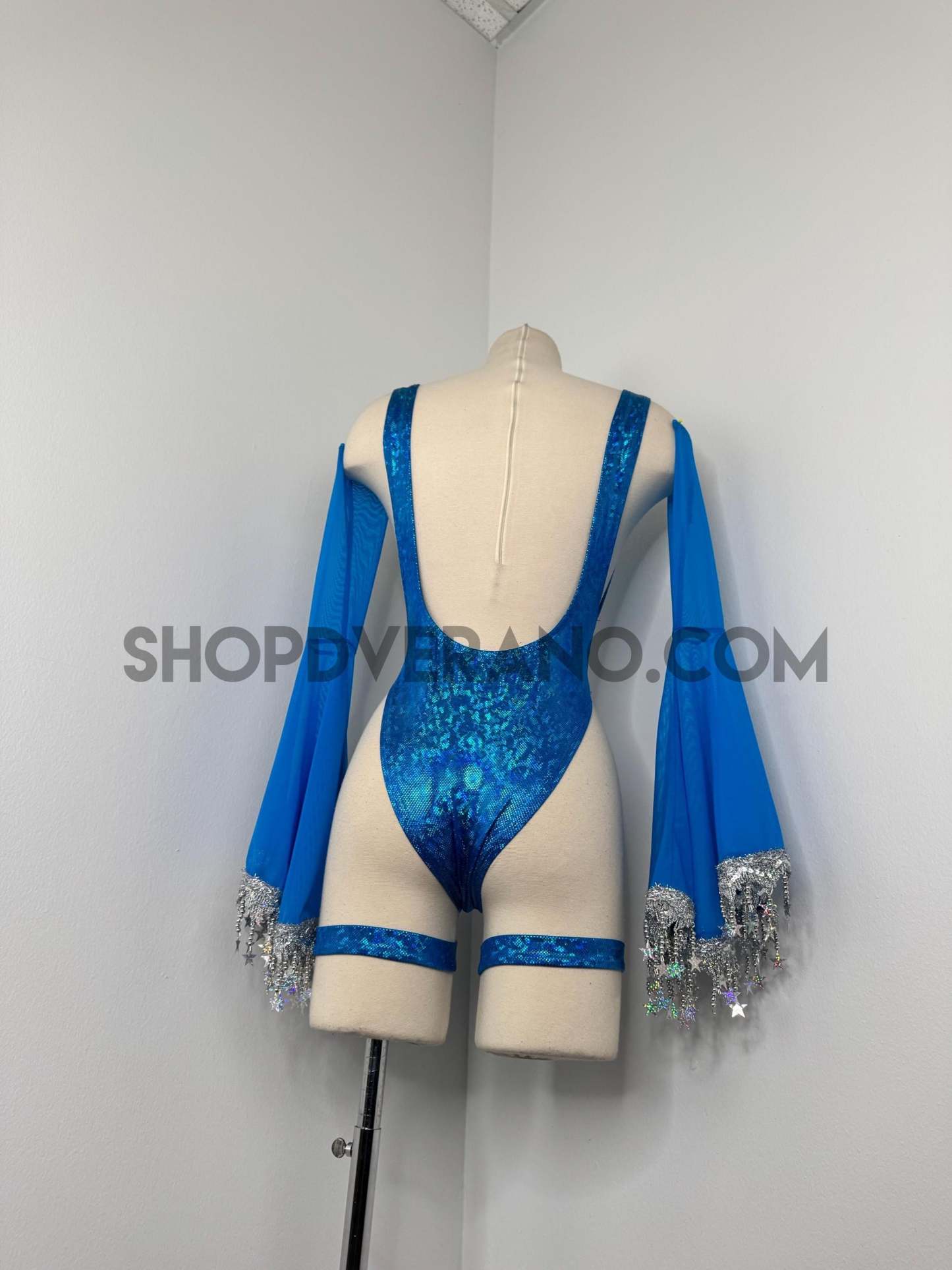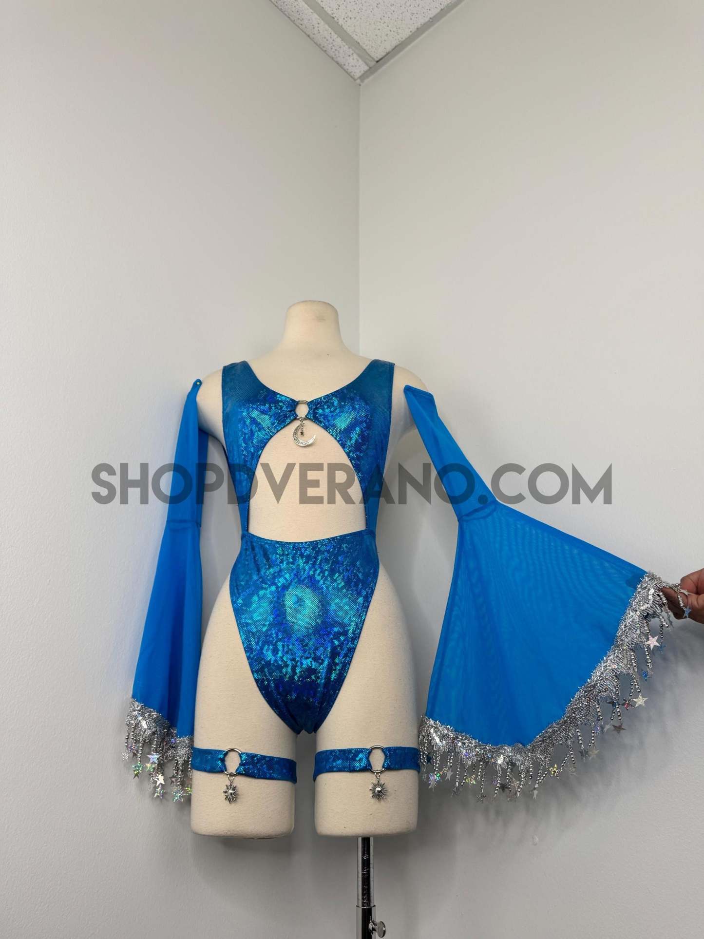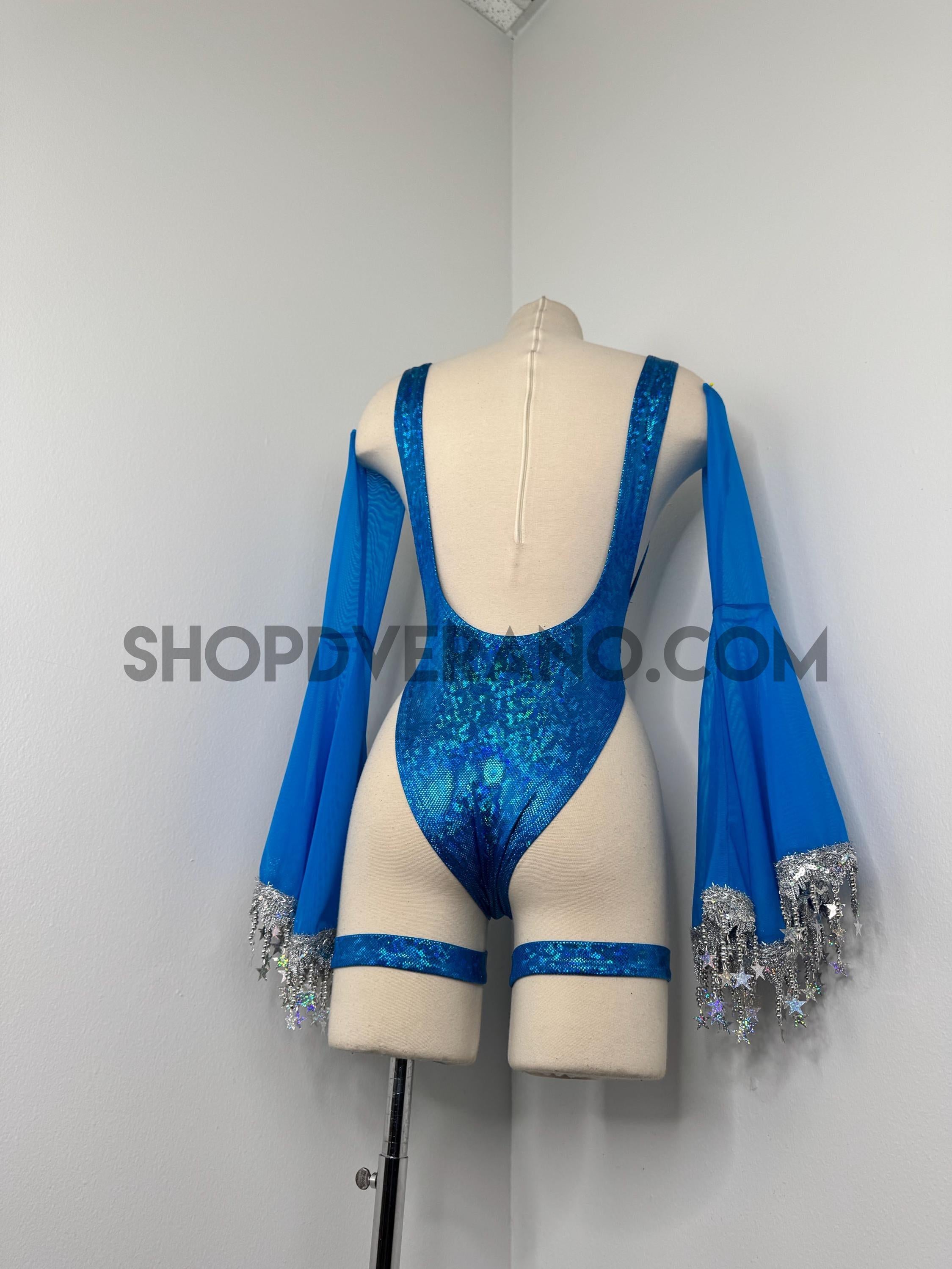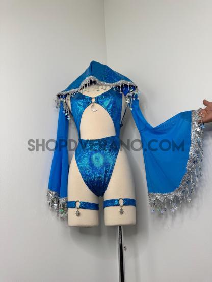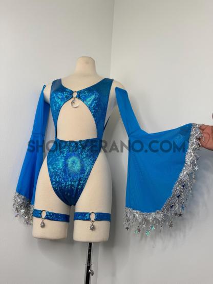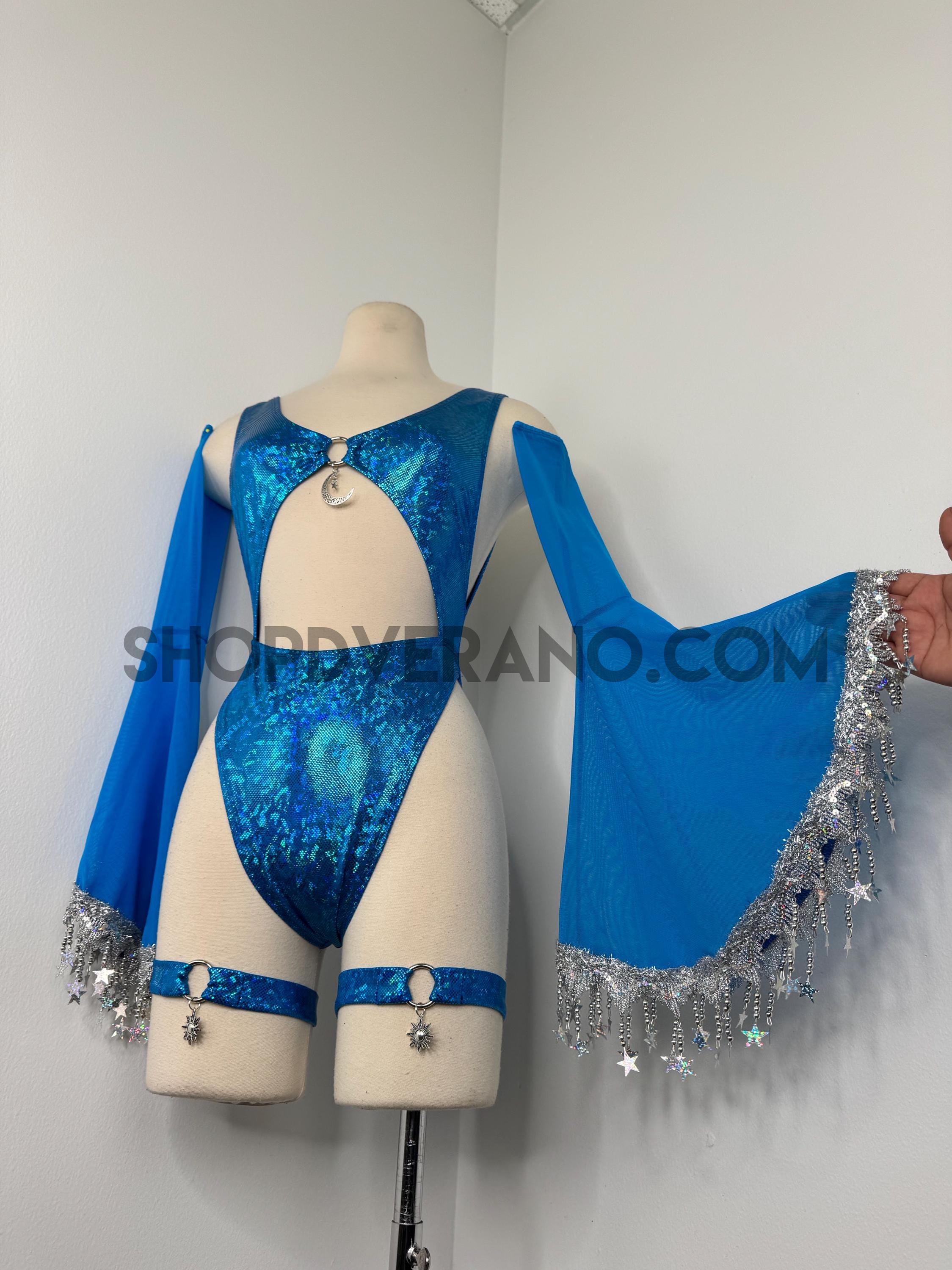 The look is elevated with a matching hooded bolero featuring star trim, adding celestial drama and movement, while flowing sleeves create an ethereal, siren-inspired silhouette. Elastic legs straps finish the look with a bold, statement touch that ties the entire set together.