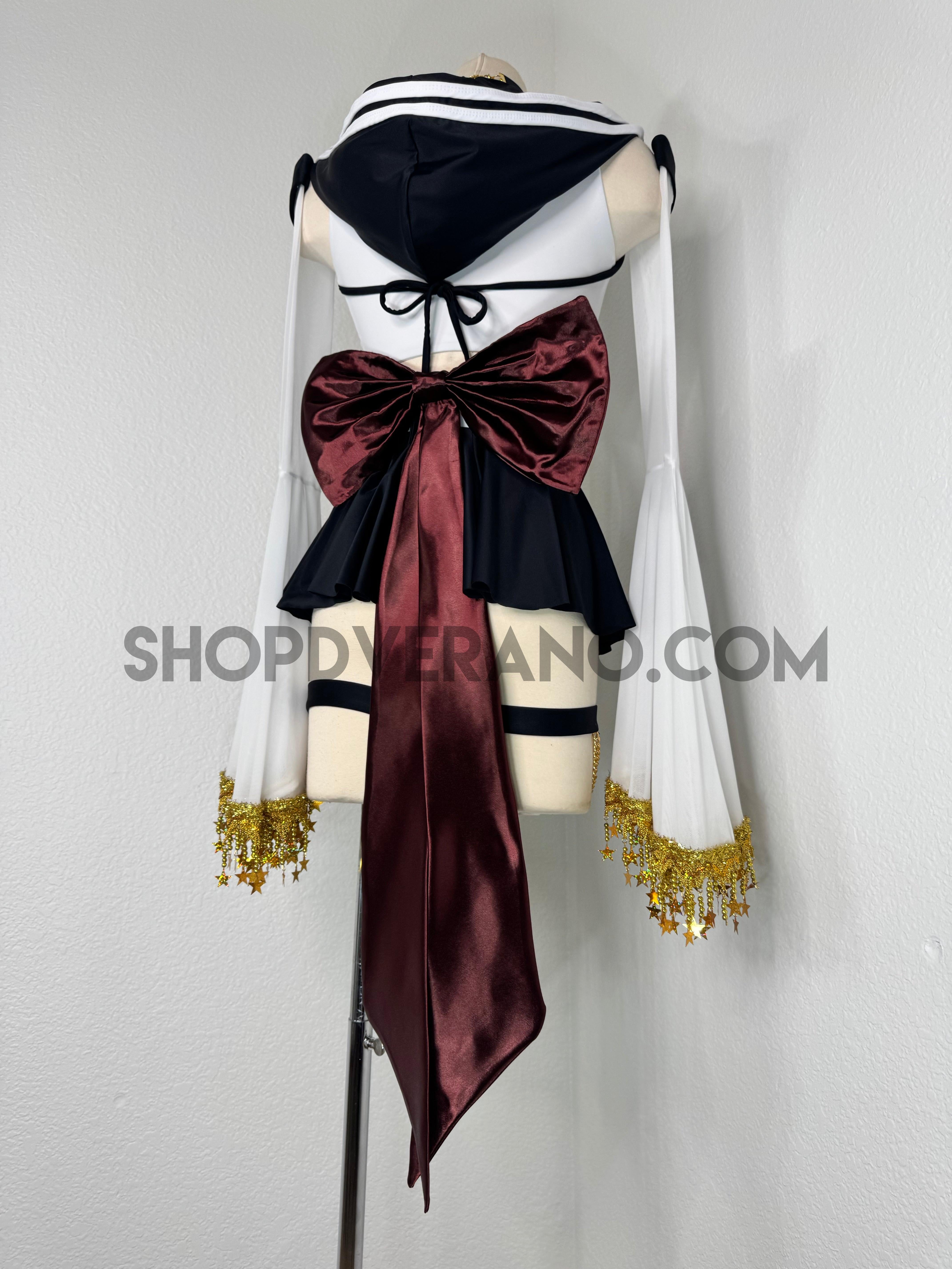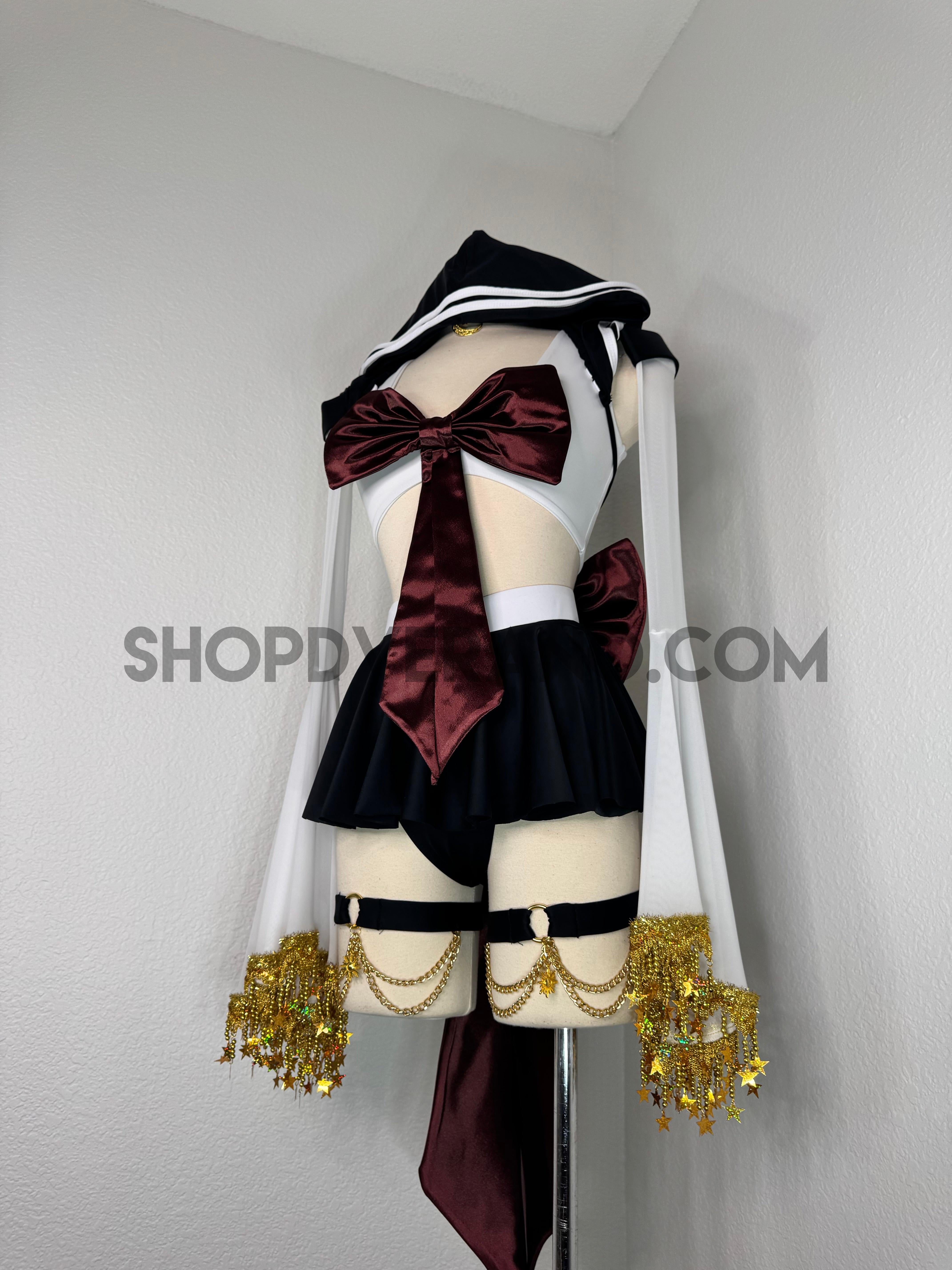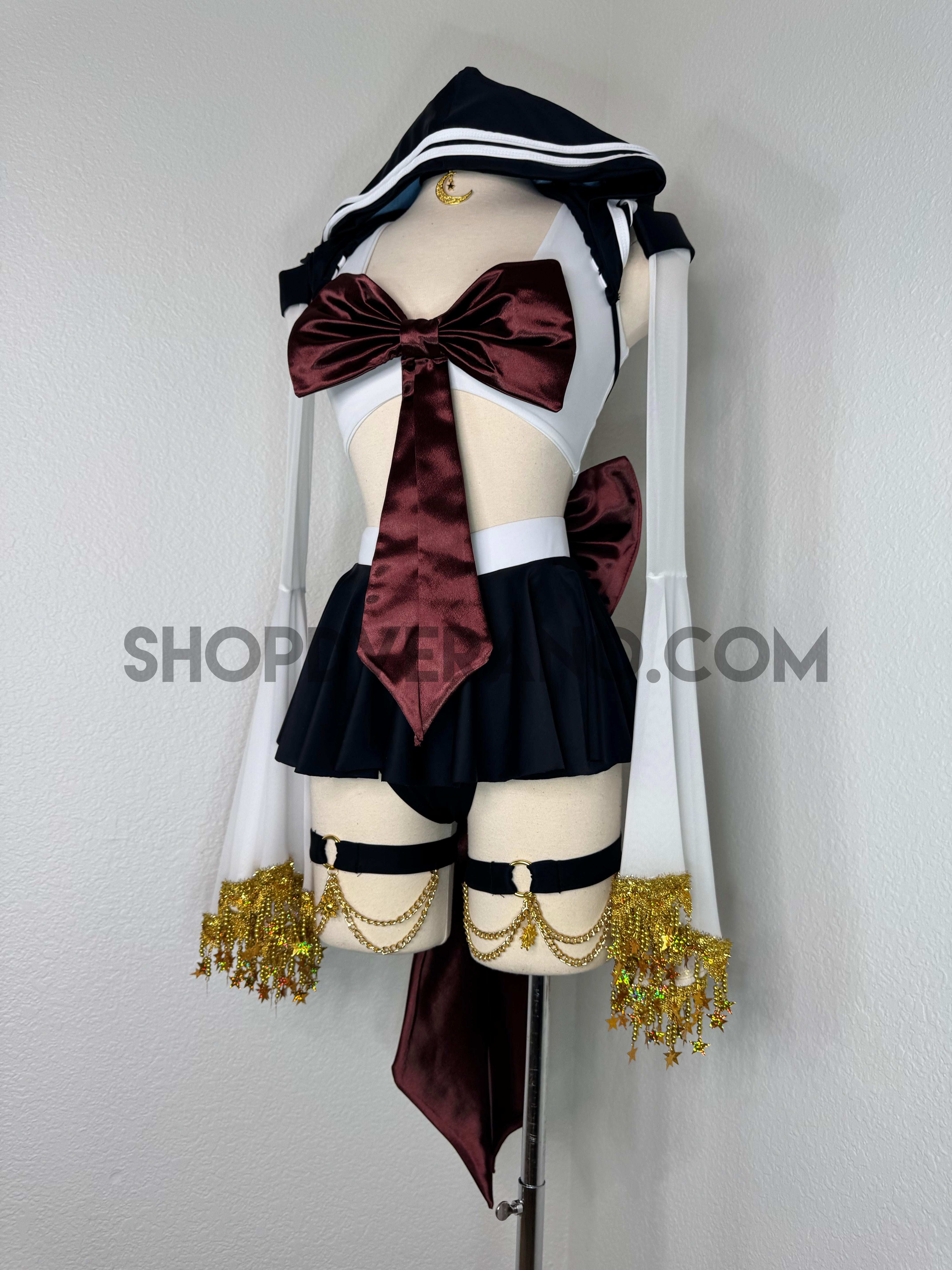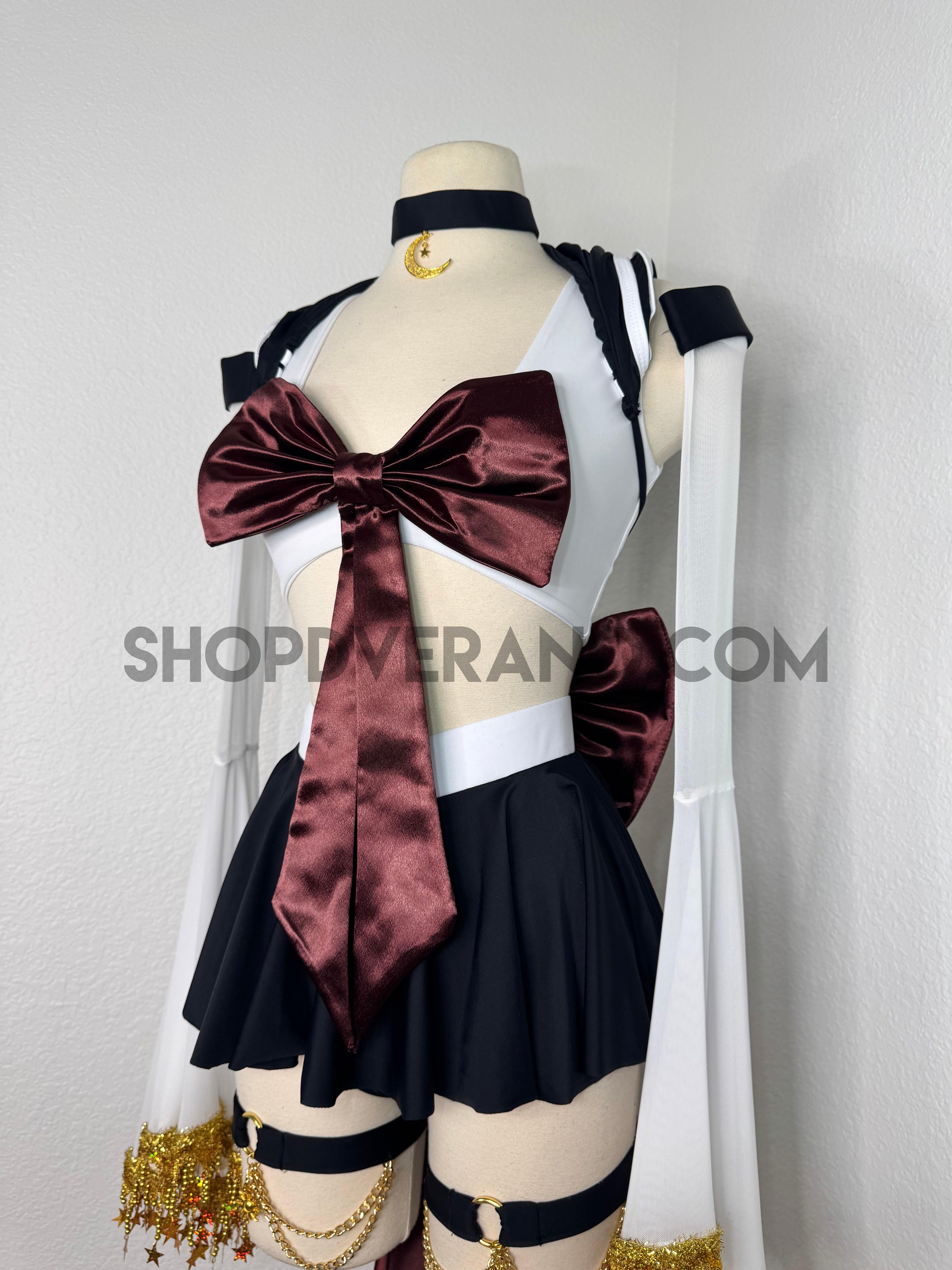 This unique ensemble features a mini skirt paired with a white crop top adorned with a removable bow. The set includes dramatic detachable sleeves in coordinating colors, finished with golden star fringe around the bell cuffs for an elegant, flowing silhouette and a distinctive celestial touch. The set also includes matching leg straps embellished with delicate gold chains and sun charms for the perfect finishing accent.