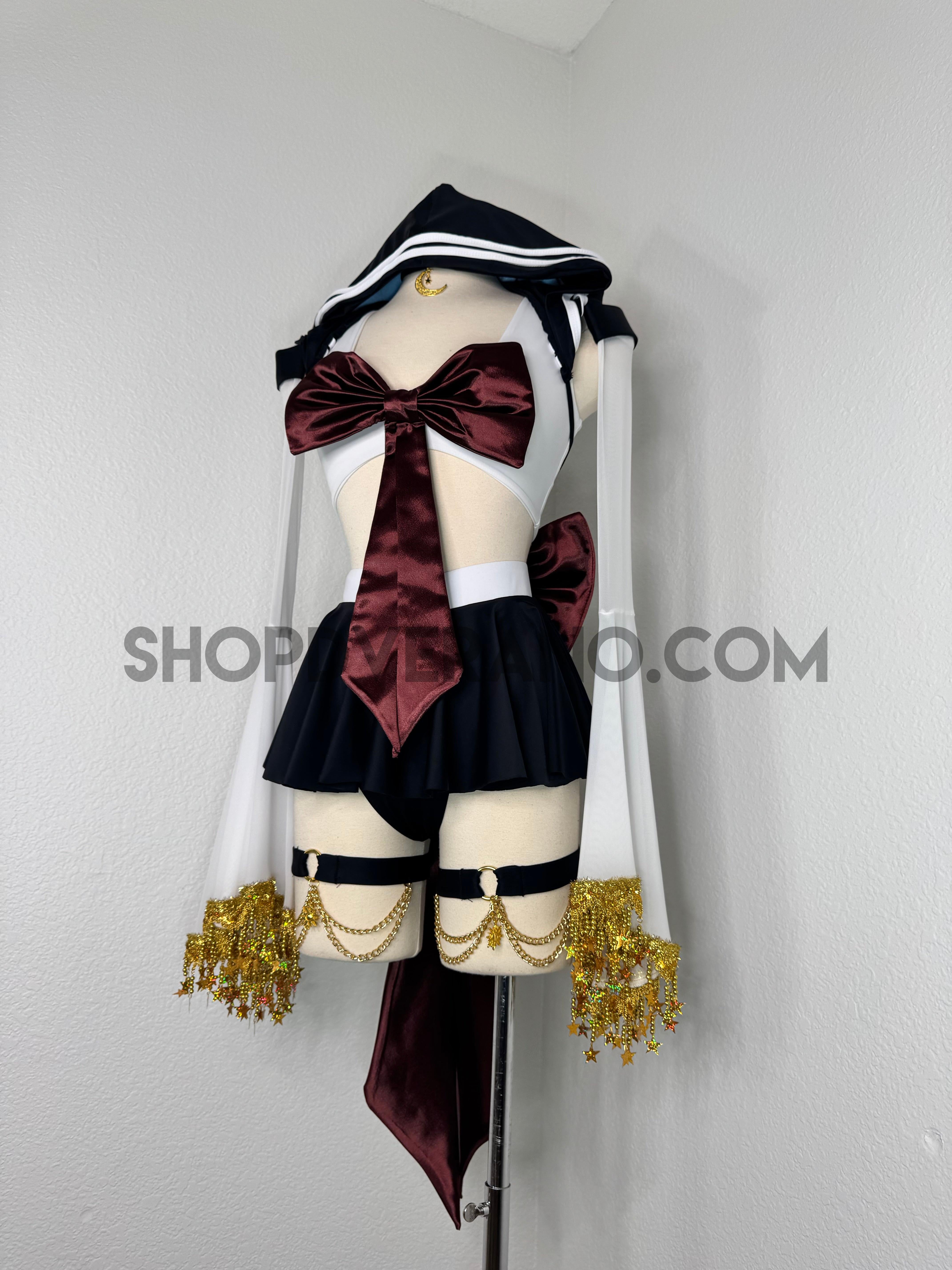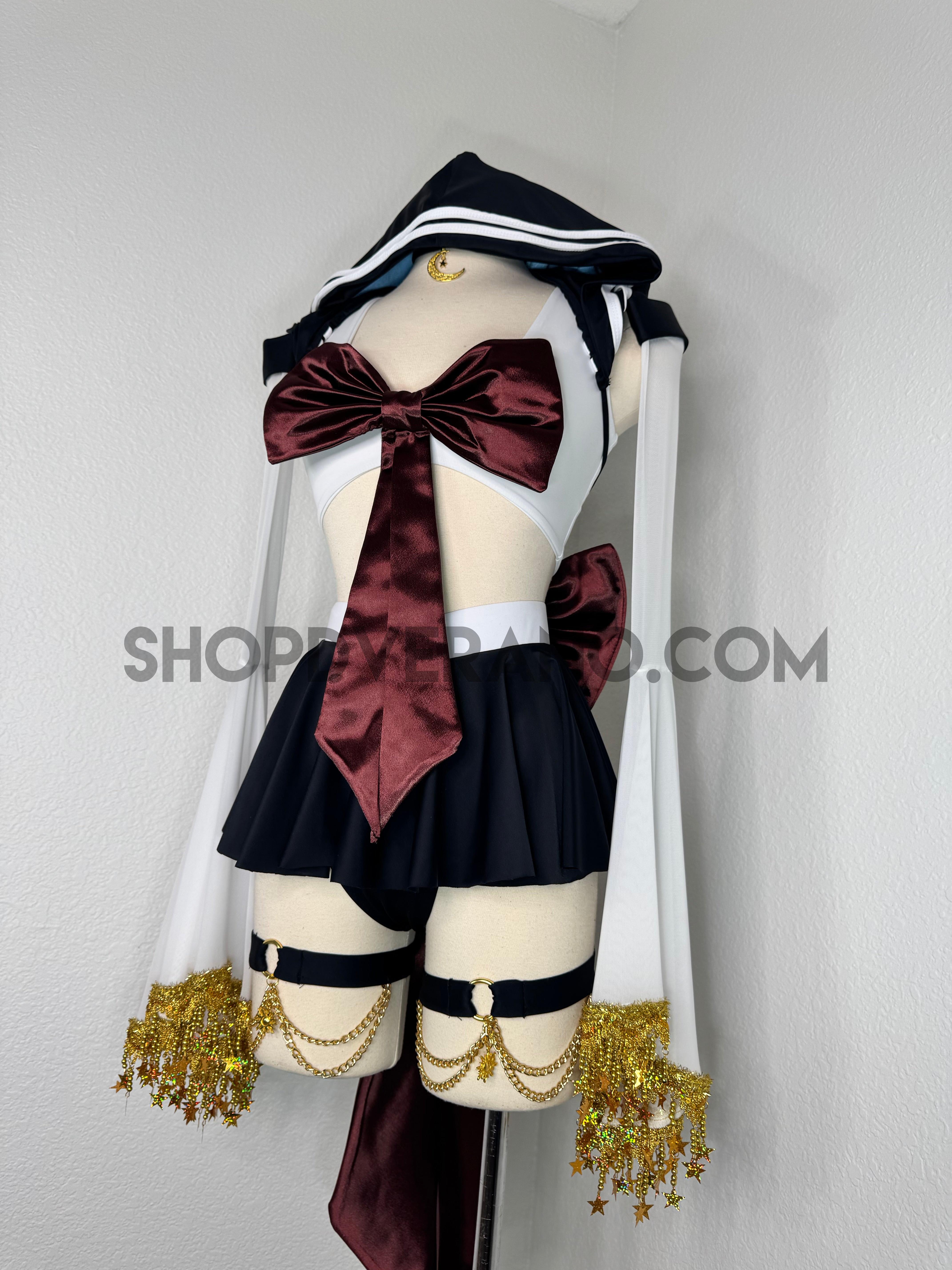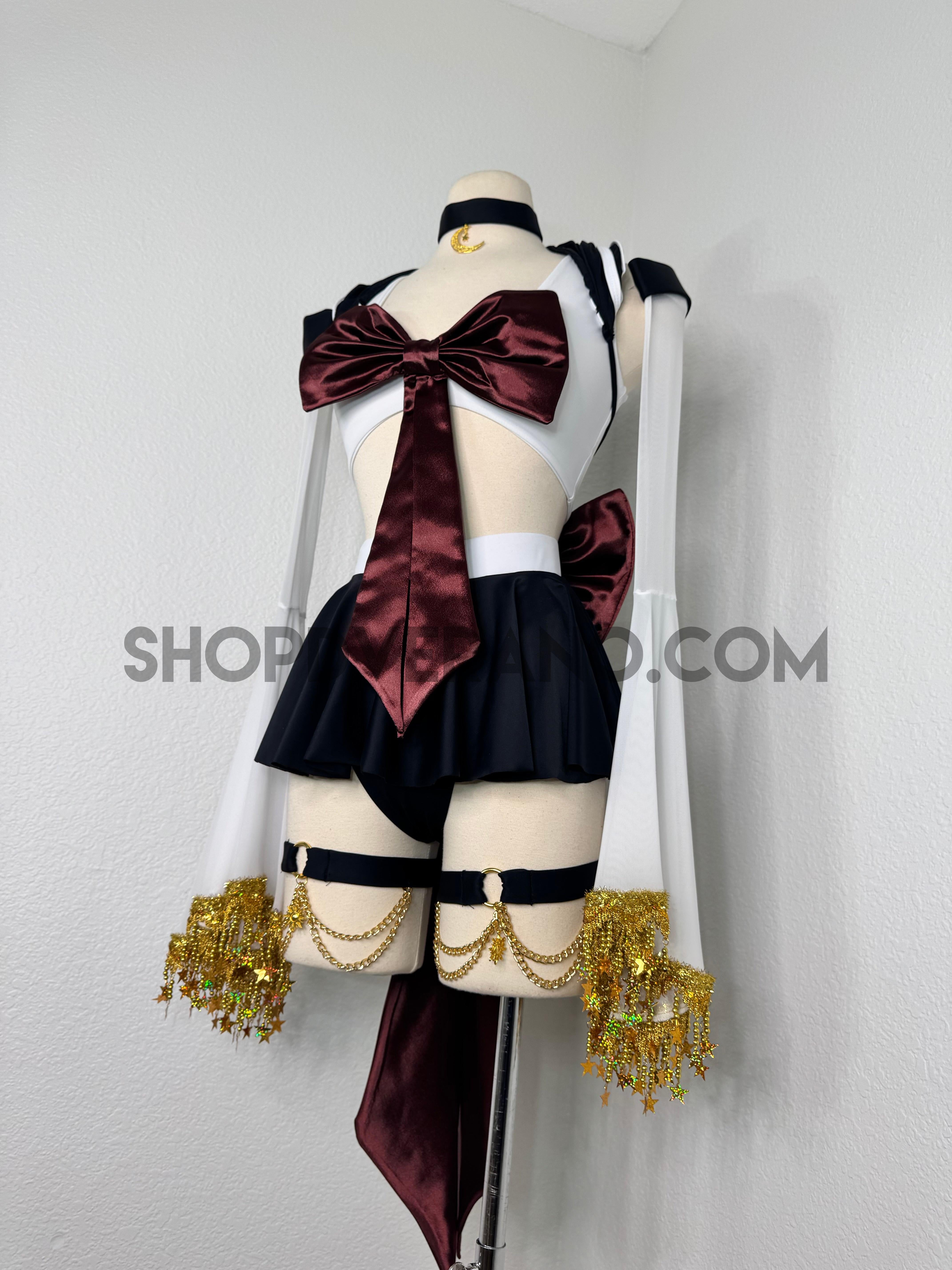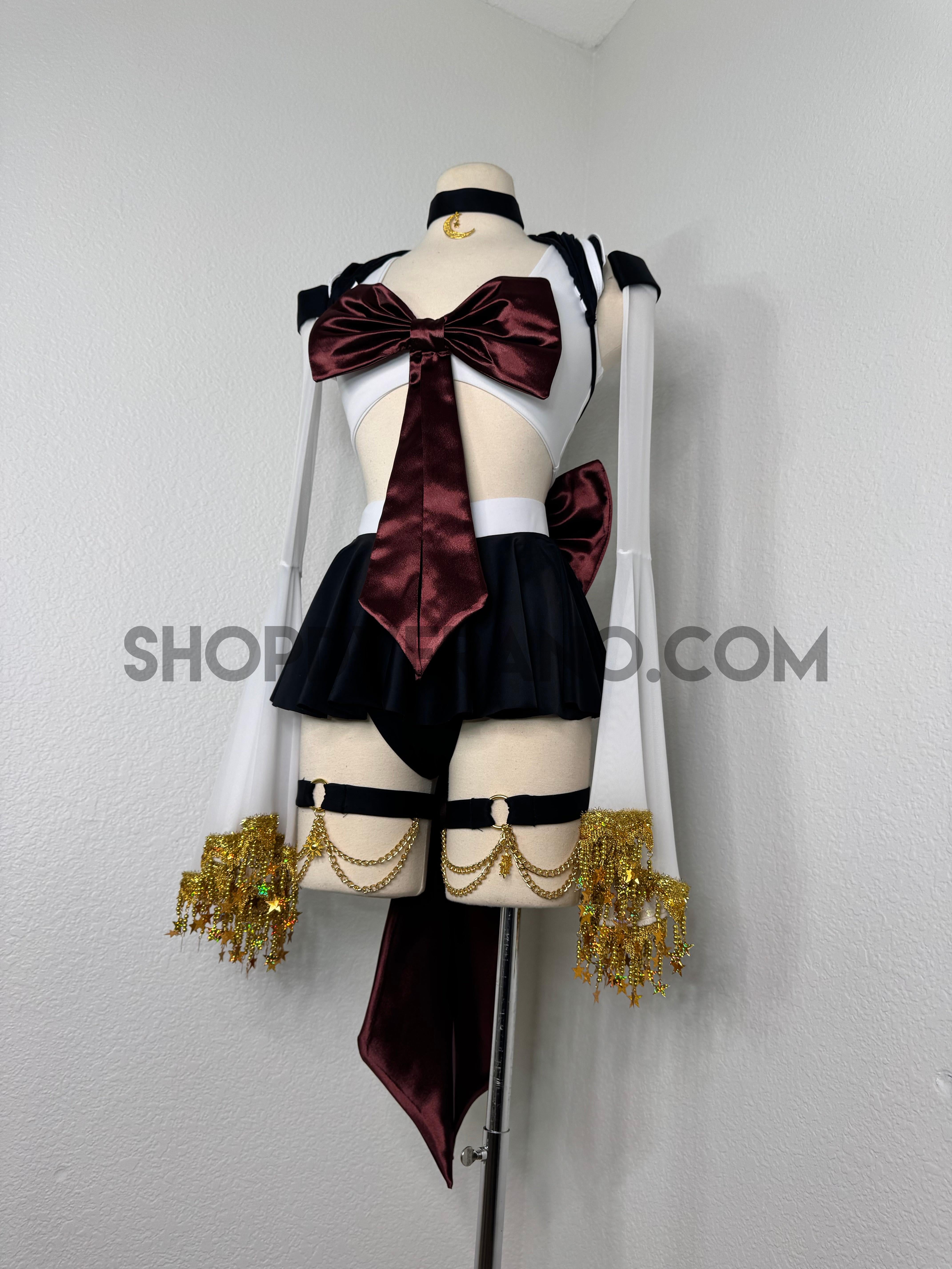 This unique ensemble features a mini skirt paired with a white crop top adorned with a removable bow. The set includes dramatic detachable sleeves in coordinating colors, finished with golden star fringe around the bell cuffs for an elegant, flowing silhouette and a distinctive celestial touch. The set also includes matching leg straps embellished with delicate gold chains and sun charms for the perfect finishing accent.