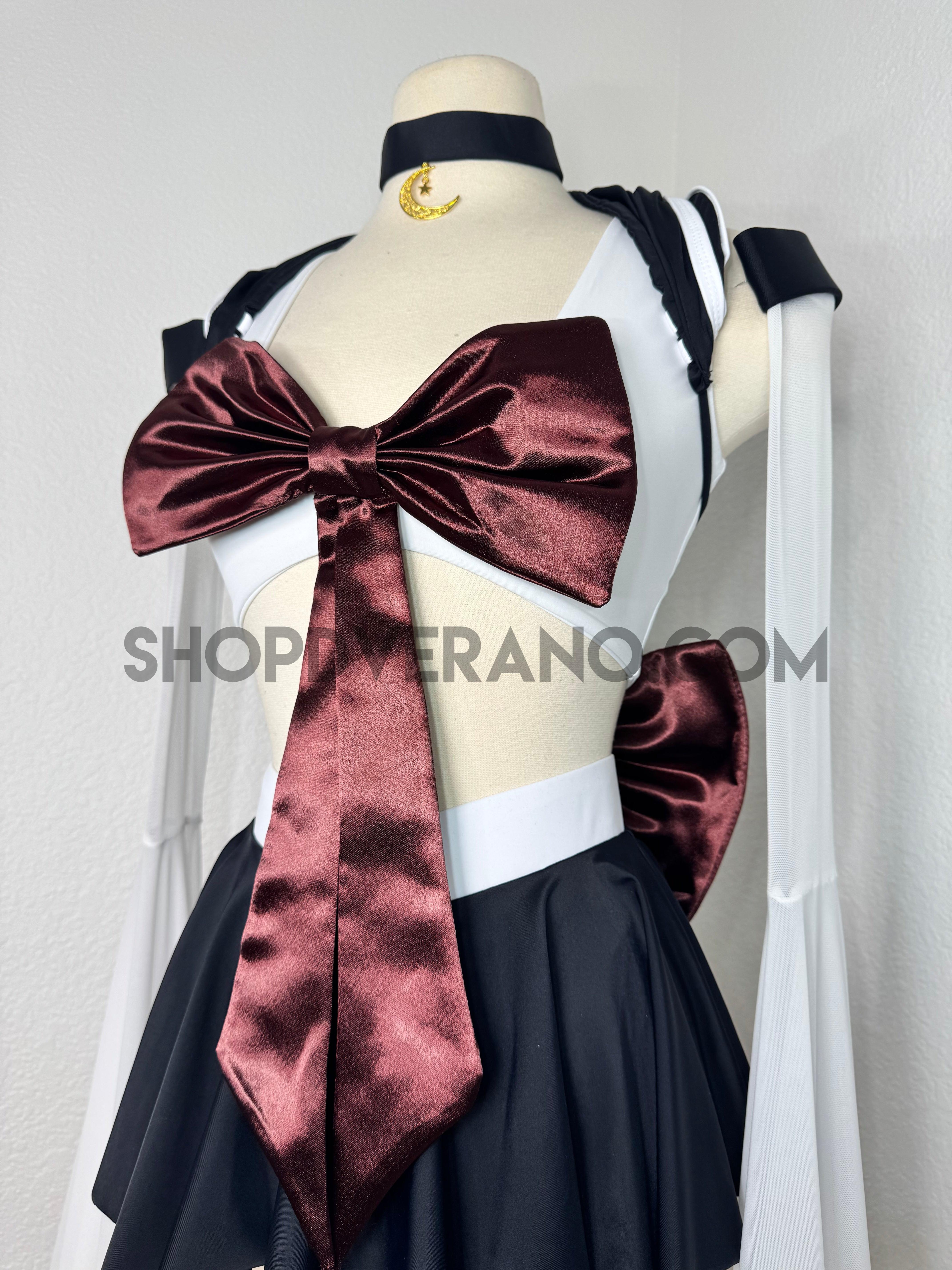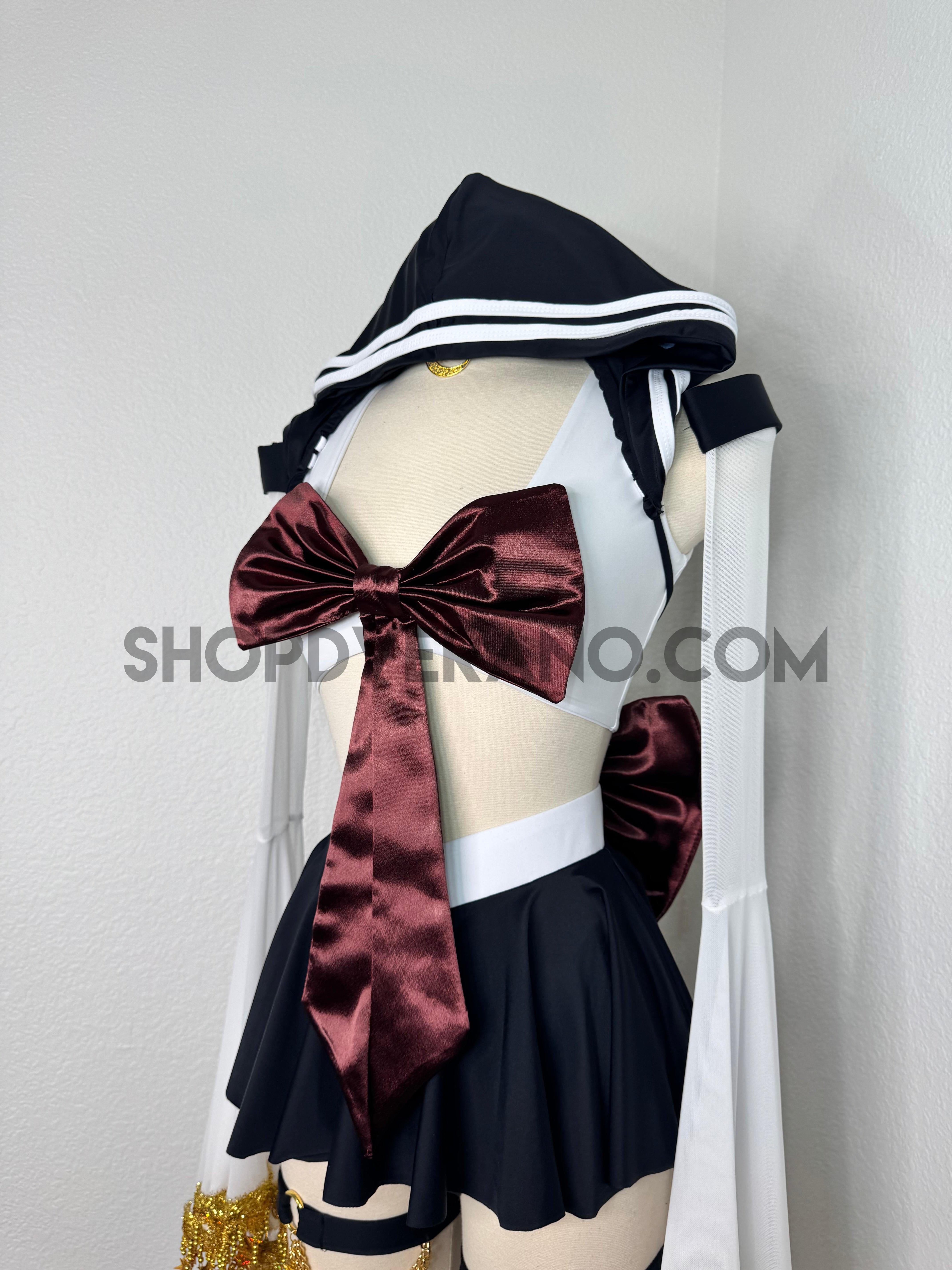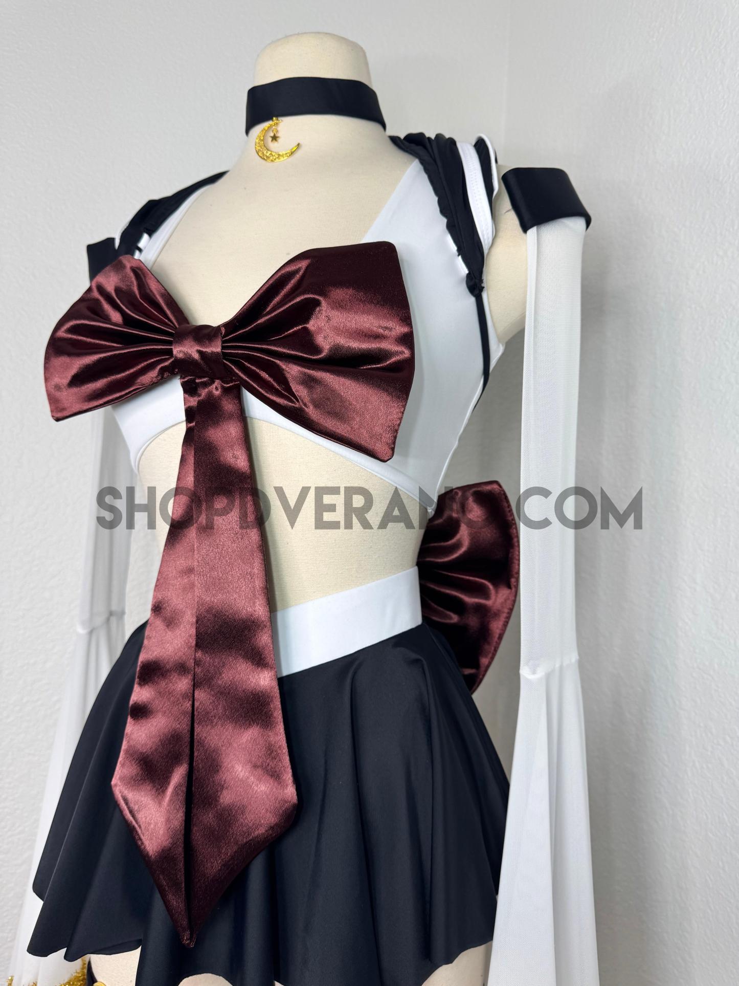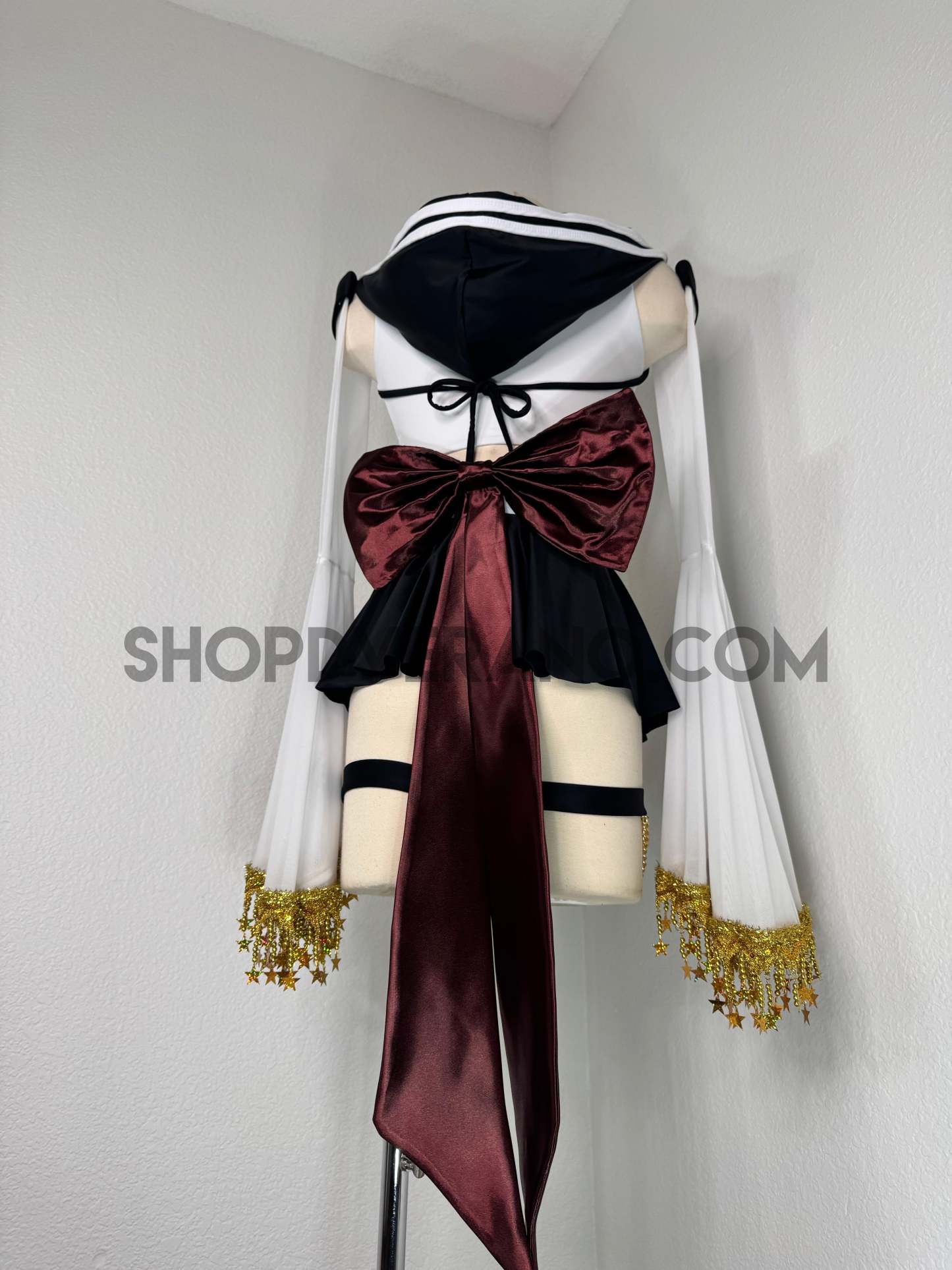 This unique ensemble features a mini skirt paired with a white crop top adorned with a removable bow. The set includes dramatic detachable sleeves in coordinating colors, finished with golden star fringe around the bell cuffs for an elegant, flowing silhouette and a distinctive celestial touch. The set also includes matching leg straps embellished with delicate gold chains and sun charms for the perfect finishing accent.