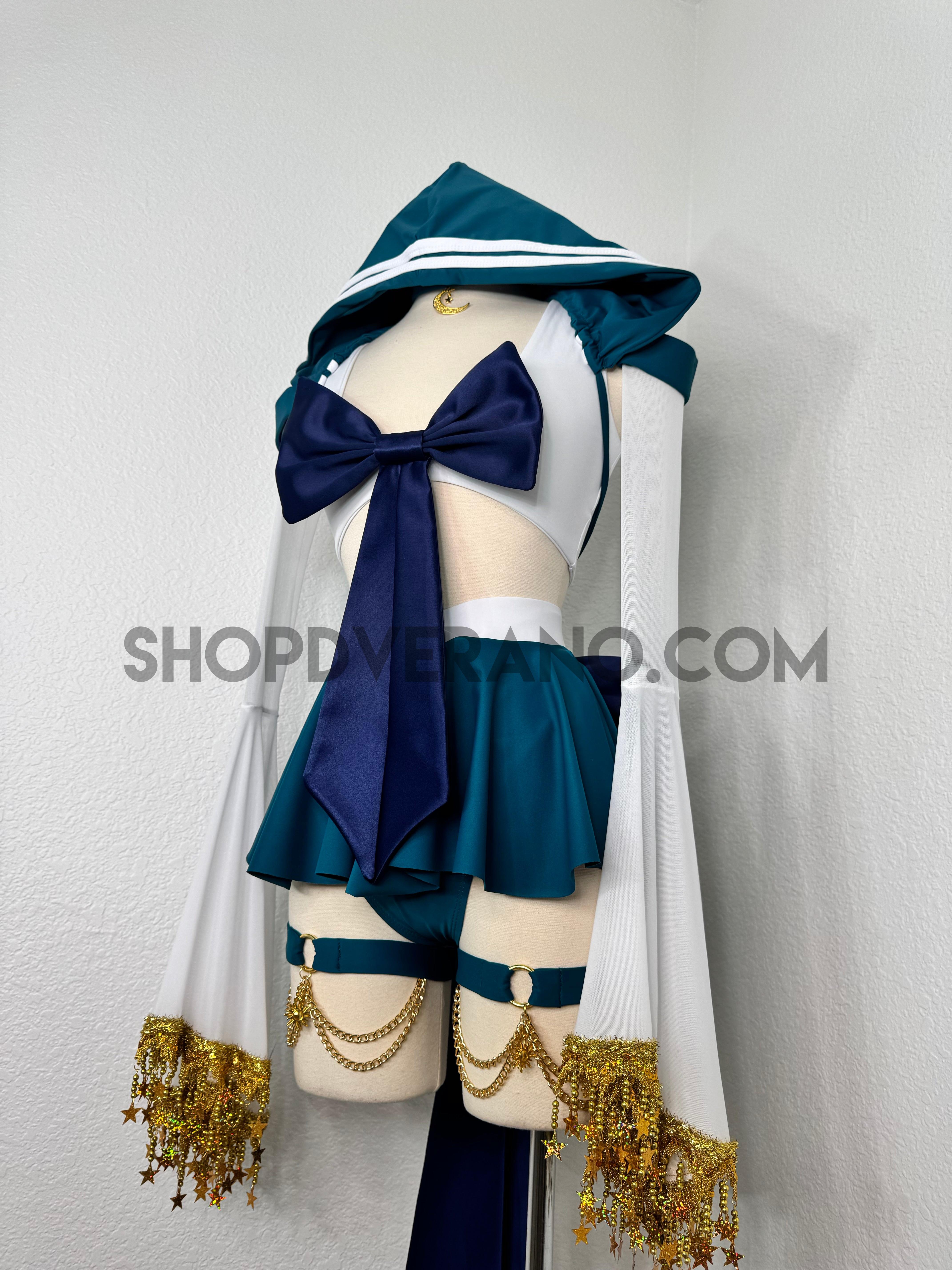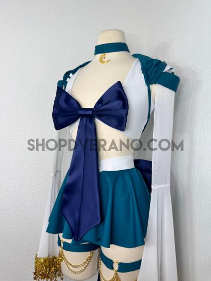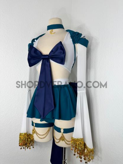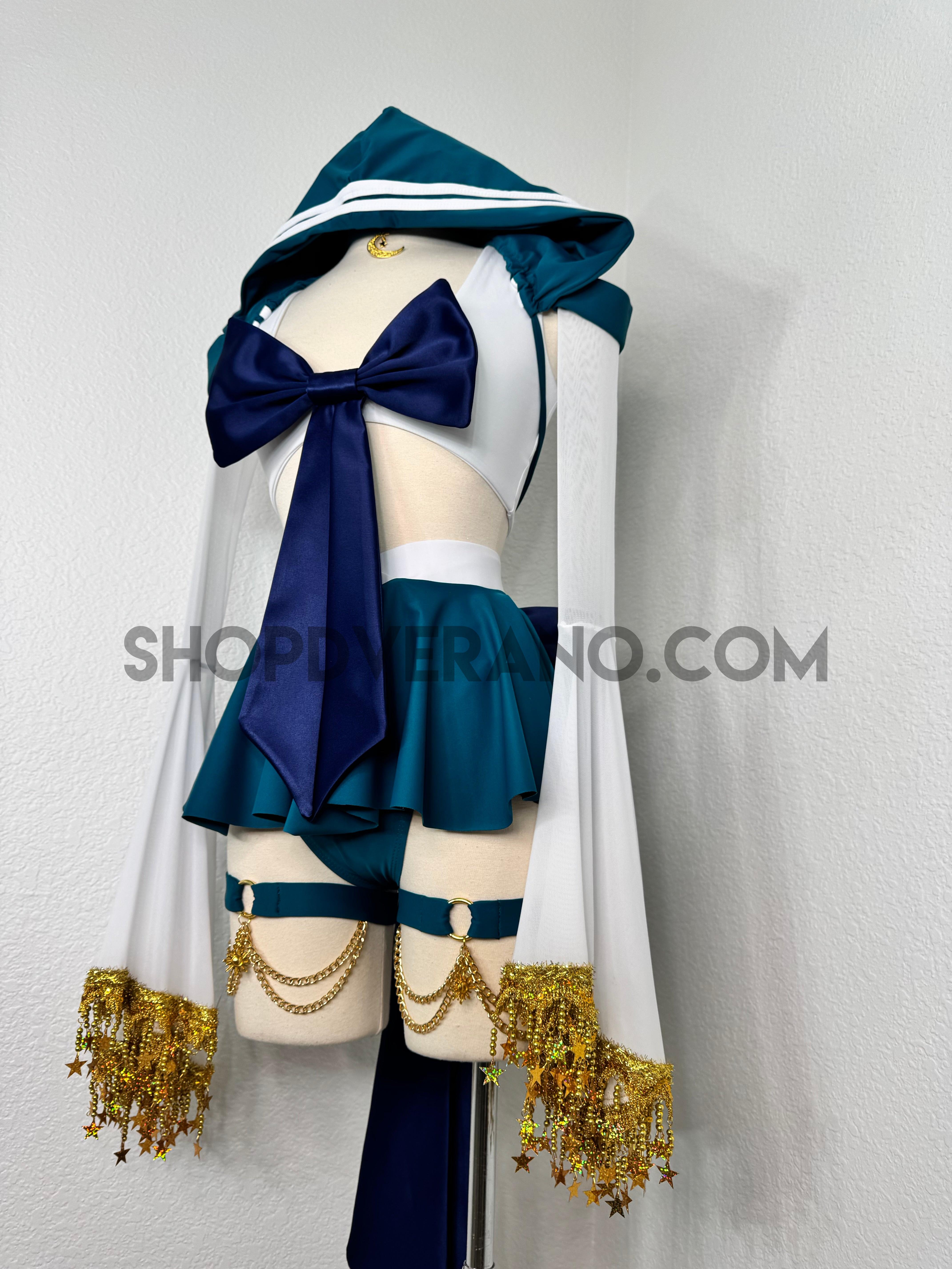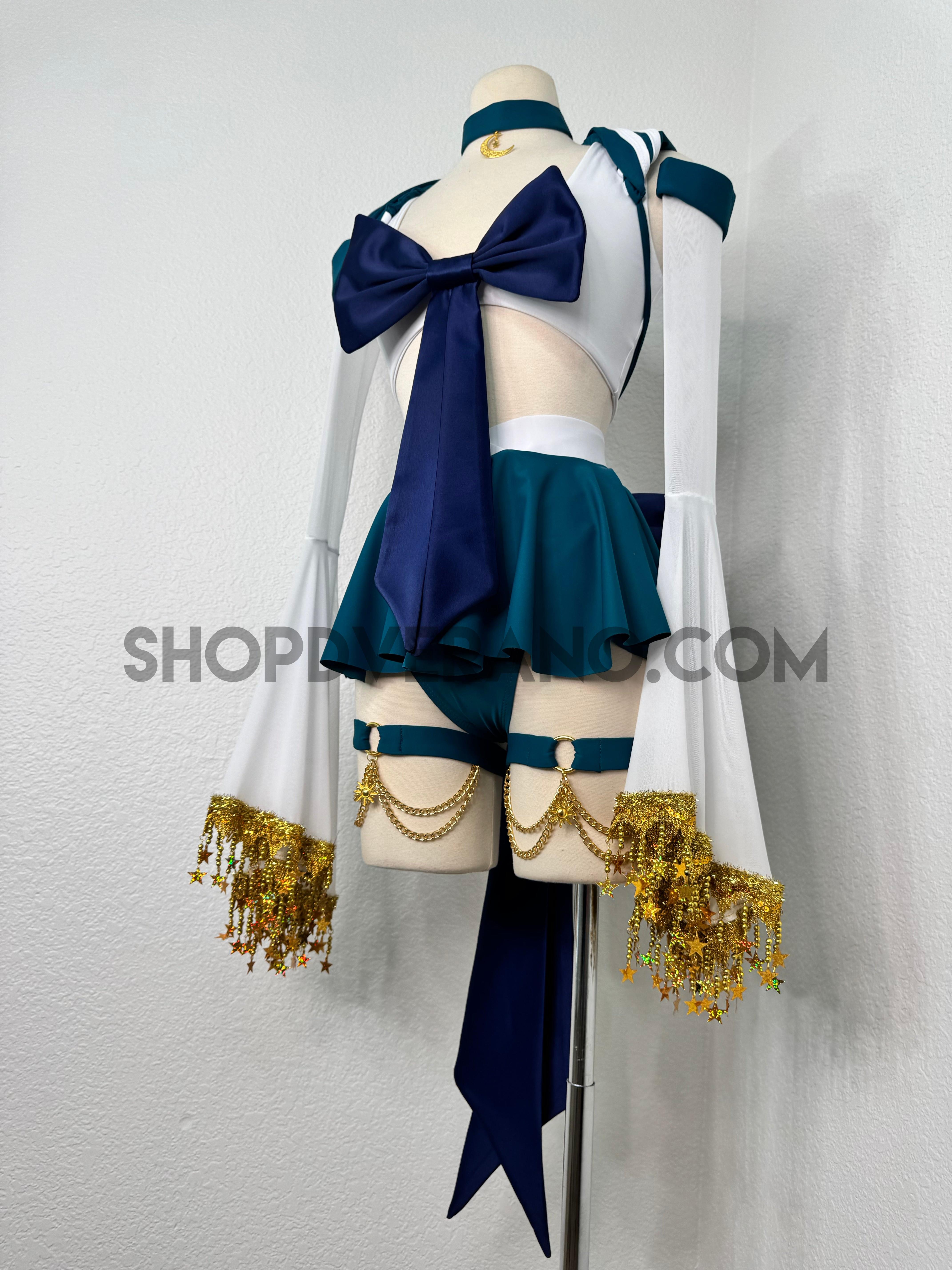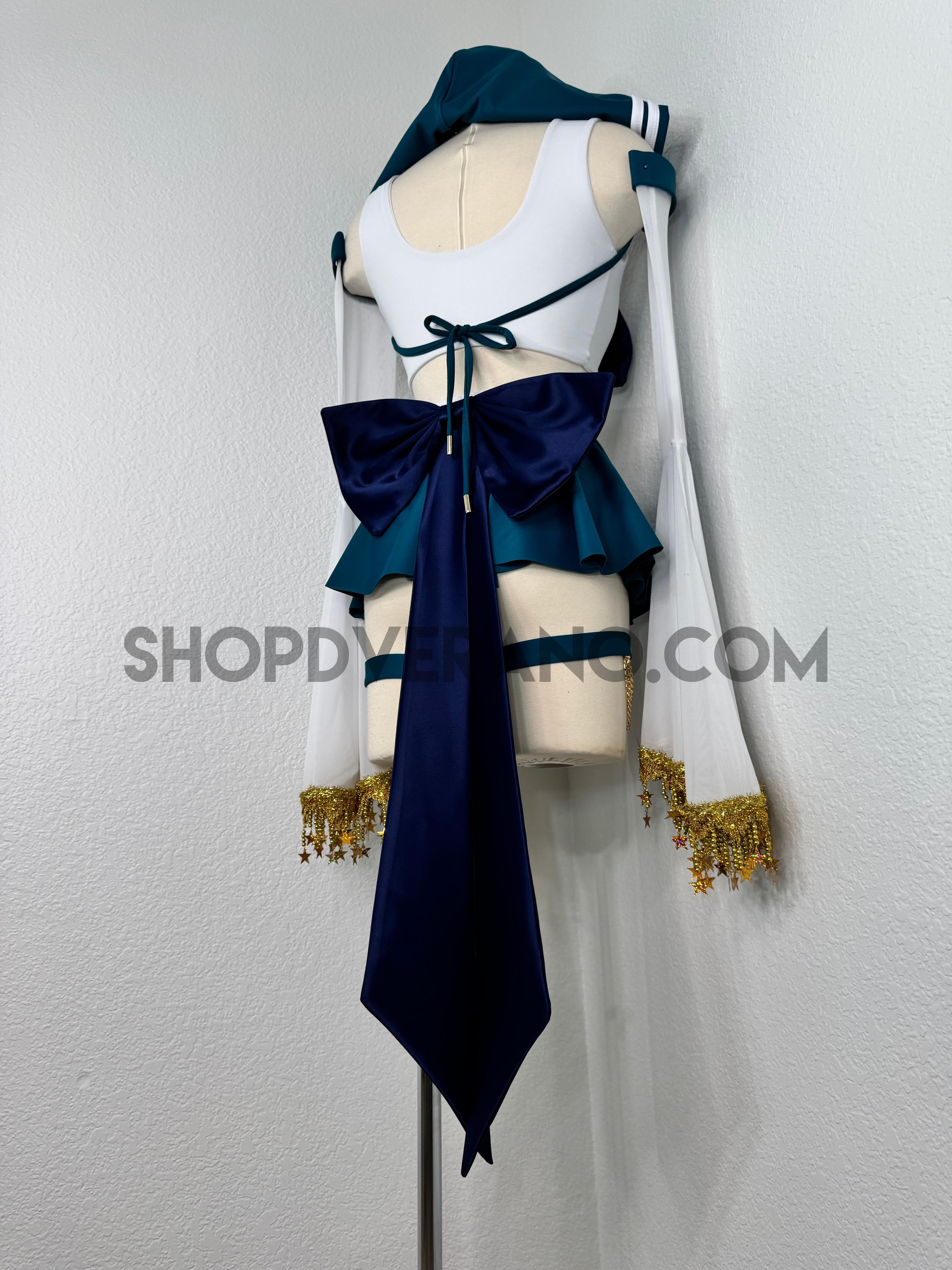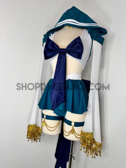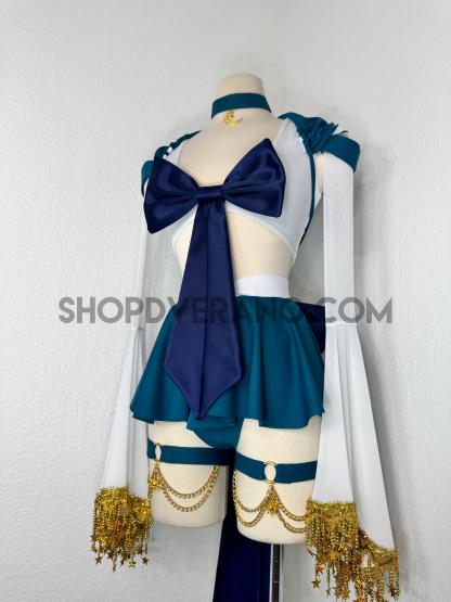 This unique ensemble features a mini skirt paired with a white crop top adorned with a removable bow. The set includes dramatic detachable sleeves in coordinating colors, finished with golden star fringe around the bell cuffs for an elegant, flowing silhouette and a distinctive celestial touch. The set also includes matching leg straps embellished with delicate gold chains and sun charms for the perfect finishing accent.