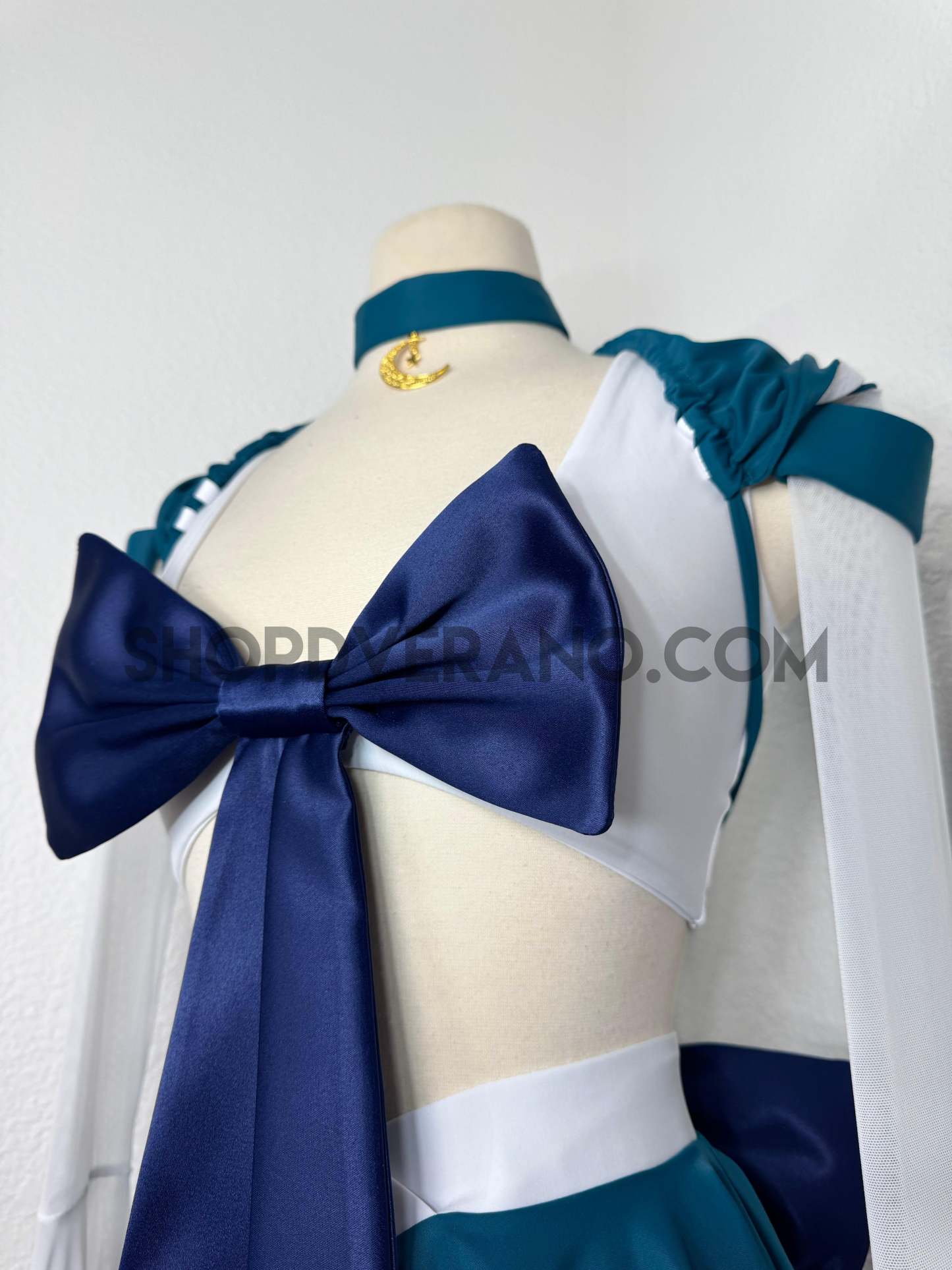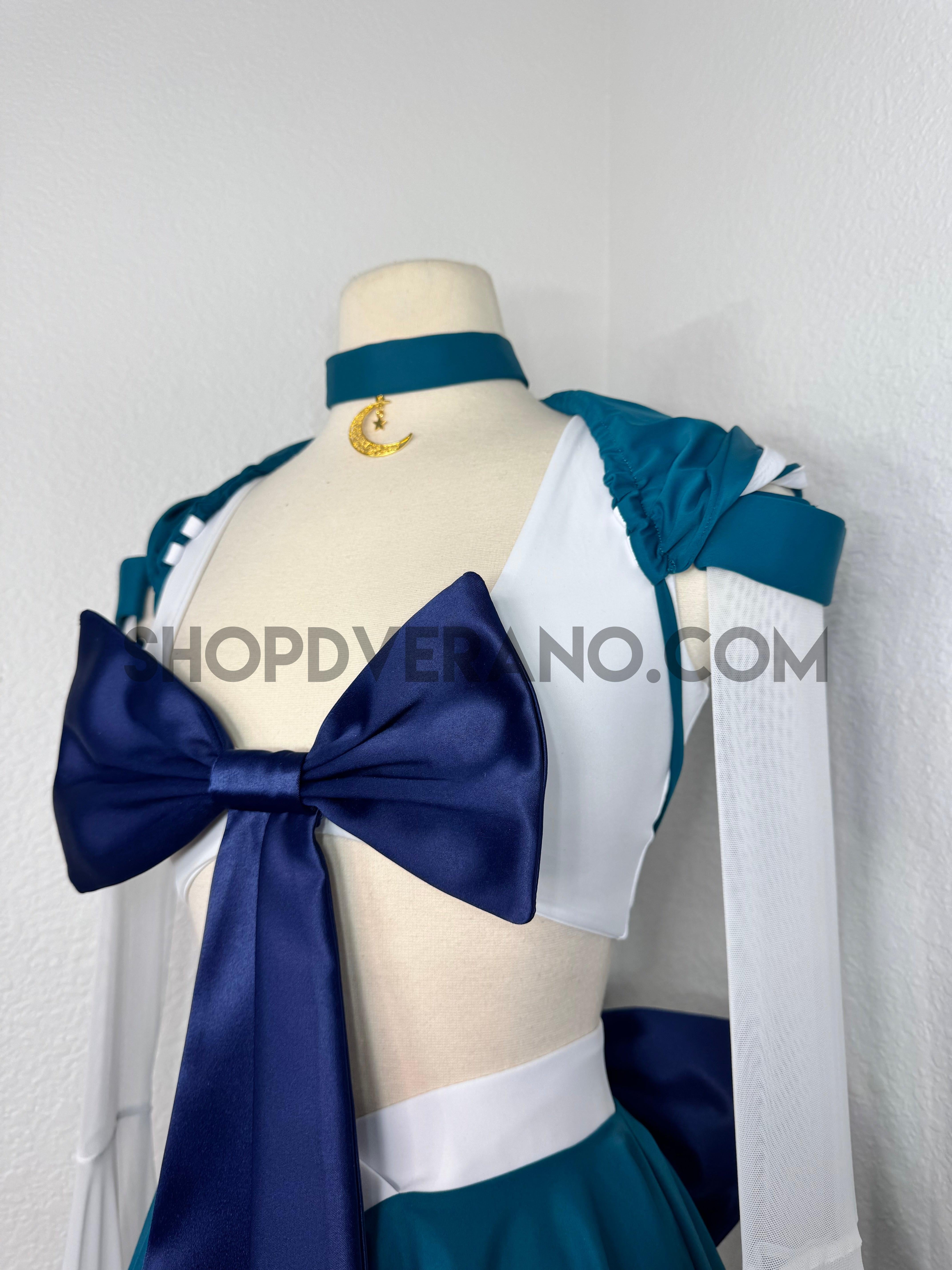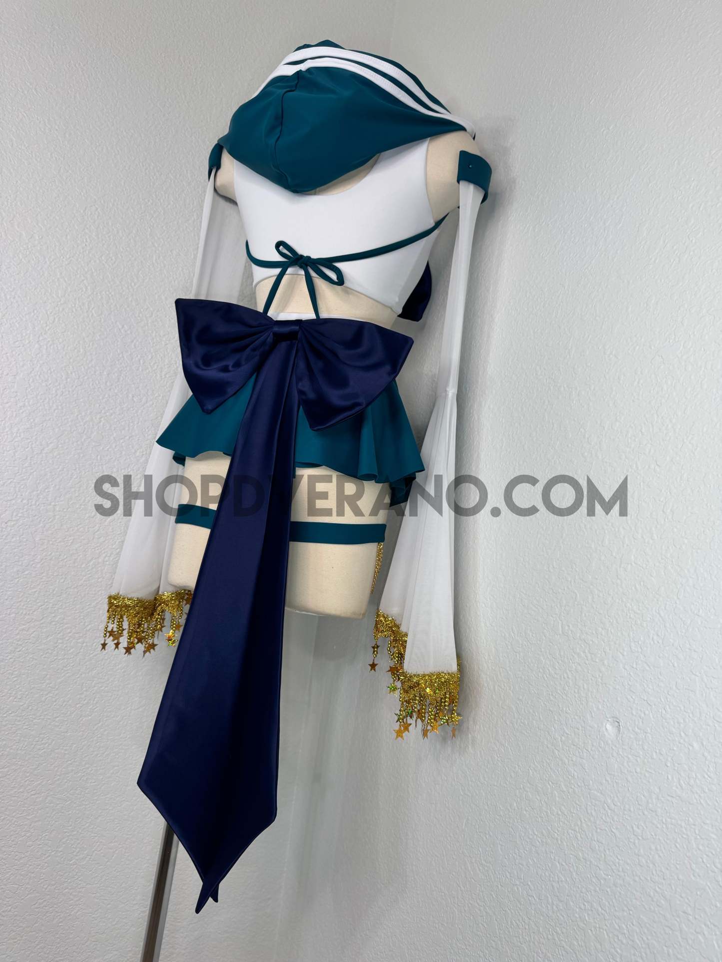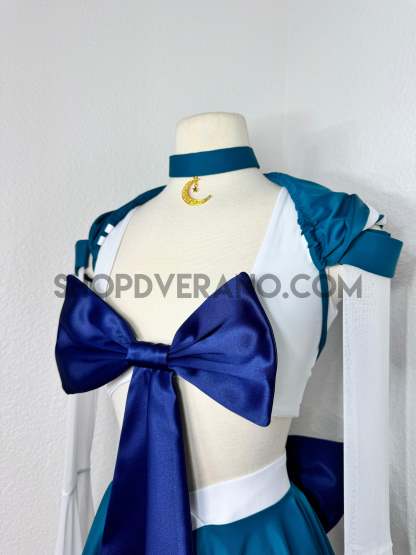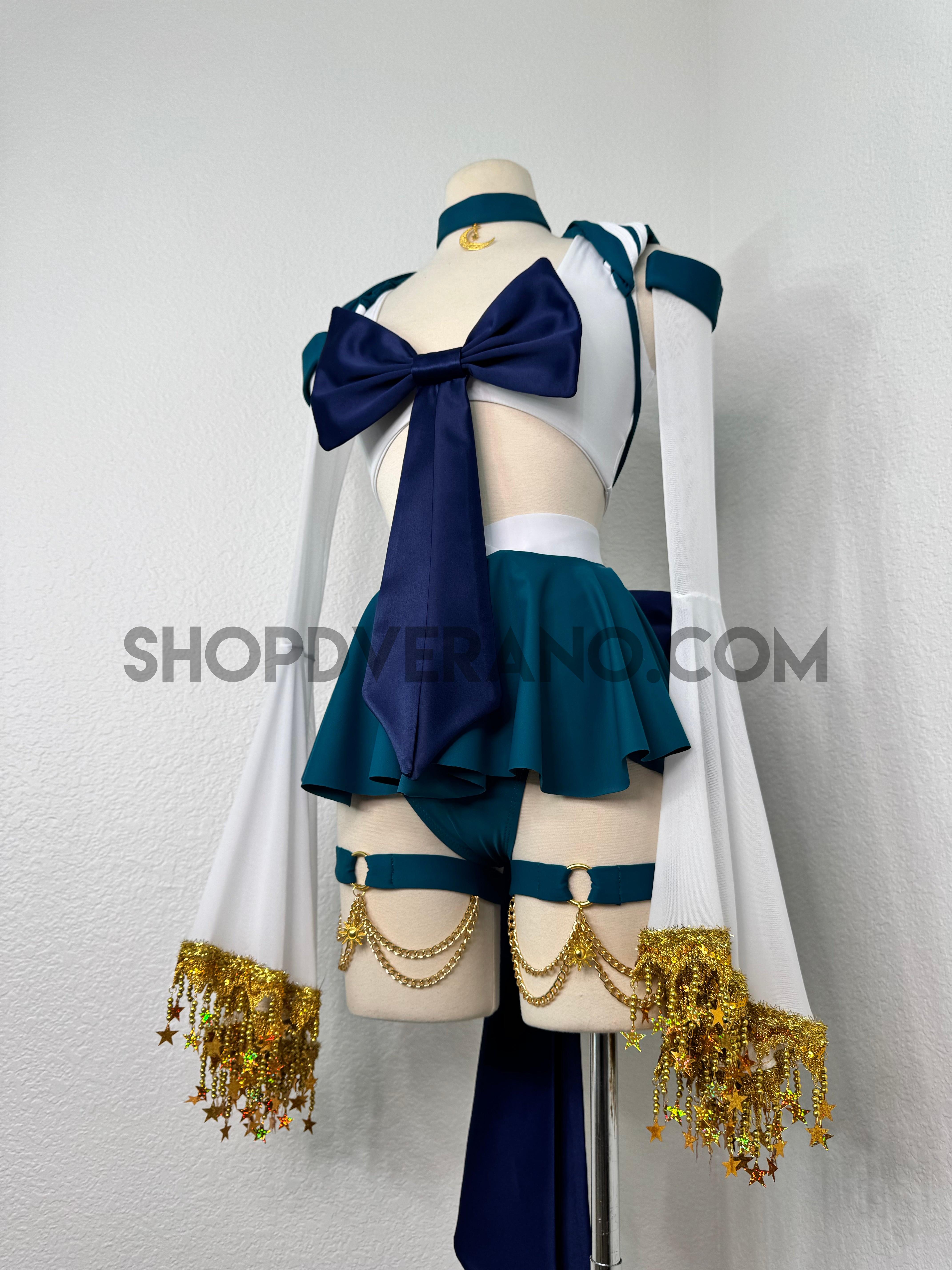 This unique ensemble features a mini skirt paired with a white crop top adorned with a removable bow. The set includes dramatic detachable sleeves in coordinating colors, finished with golden star fringe around the bell cuffs for an elegant, flowing silhouette and a distinctive celestial touch. The set also includes matching leg straps embellished with delicate gold chains and sun charms for the perfect finishing accent.